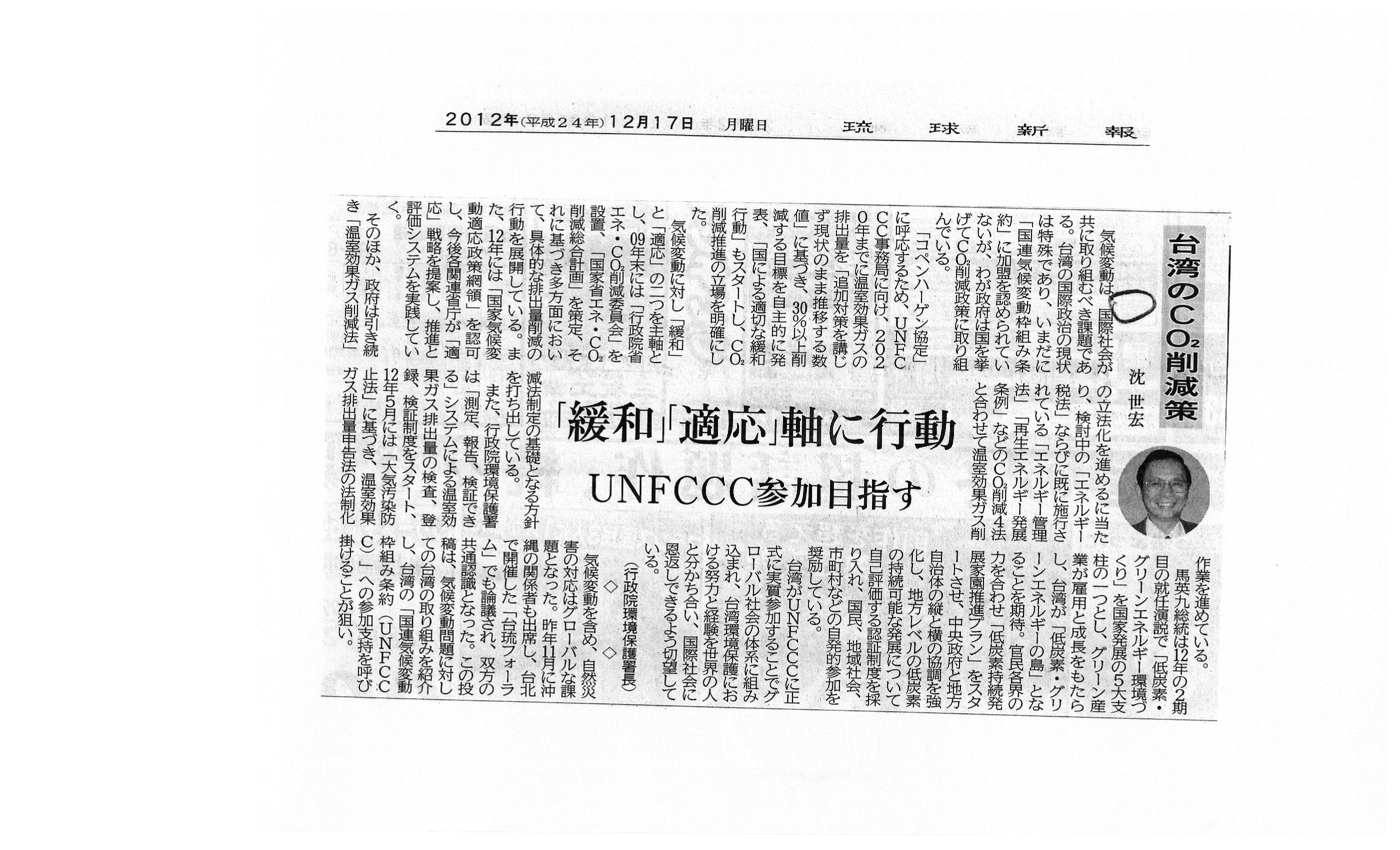 沖繩縣內最大的媒體「琉球新報」於12月17日刊登環保署署長沈世宏撰寫的專文《因應氣候變遷、台灣積極面對》一文。沈世宏署長於文中說明國內政府主動呼應全球減碳行動,落實節能政策,並承諾於2020年達成溫室氣體排放總量比排放基線減少30%的目標,另外,並成立「行政院節能減碳推動會」,以「減緩」及「調適」兩大主軸推動減碳行動。同時,推動「溫室氣體減量法」、「能源稅法」的立法,並結合已施行的「能源管理法」及「再生能源發展條例」,作為減碳行的法源依據。此外,馬英九總統也揭示:「打造低碳綠能環境」是國家發展五大支柱之一,期盼能將台灣打造成為「低碳綠能島」,並且在面對全球氣候變遷的狀況下,呼籲國際社會正視台灣希望參與聯合國氣候變化綱要公約(UNFCCC)的聲音與訴求,將台灣納入全球互助體系。而事實上,2011年11月在台灣舉辦的台琉論壇上,台沖雙方曾就共同合作防災等議題進行討論並獲得共識。因此,更希望藉由此次報導的刊登能讓日本民眾了解台灣對節能減碳的努力,並進而爭取日本輿論對我國參與UNFCCC的支持。