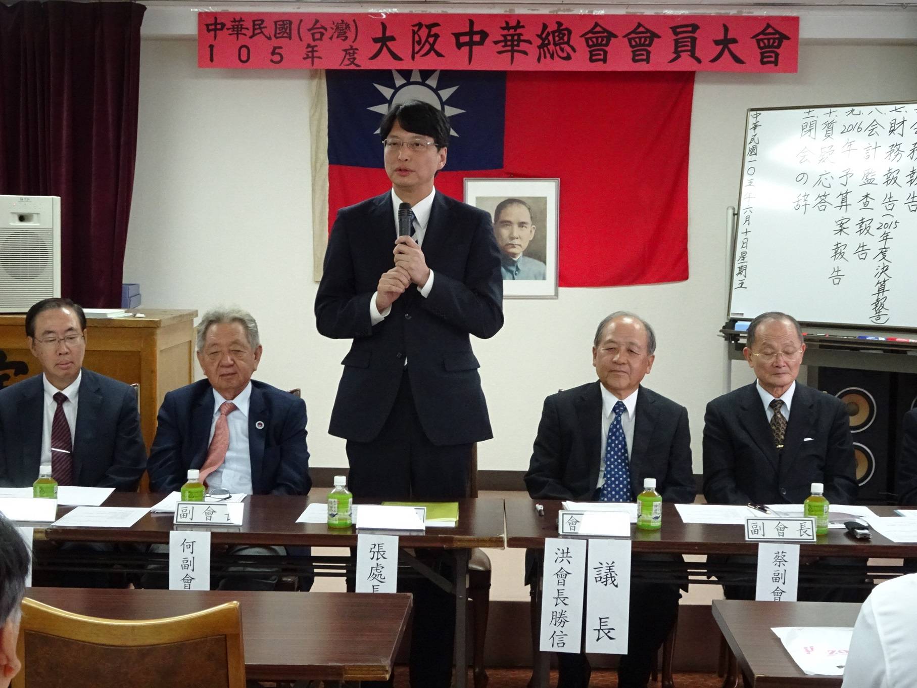 大阪中華總會於6月10日召開105年會員大會並介紹理監事會成員,駐大阪辦事處處長張仁久、僑務組副組長黃水益列席參加。