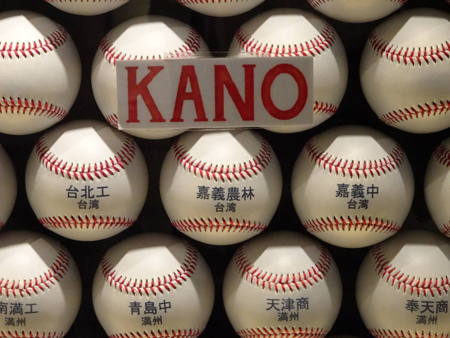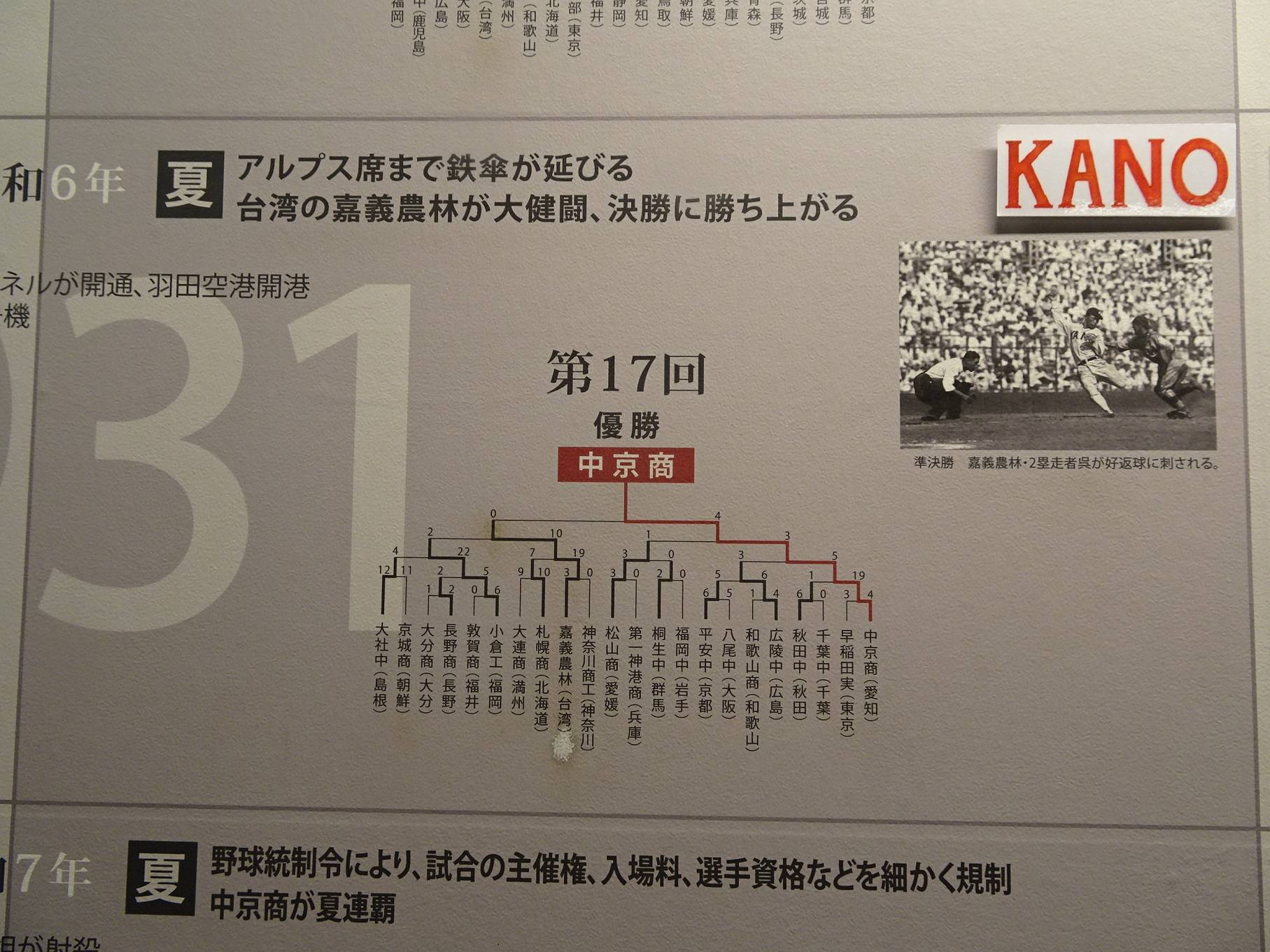 甲子園歷史館內展示板。嘉義農林下方,因台灣觀光客用手指著拍照而斑駁。右上方為當年比賽時的照片。