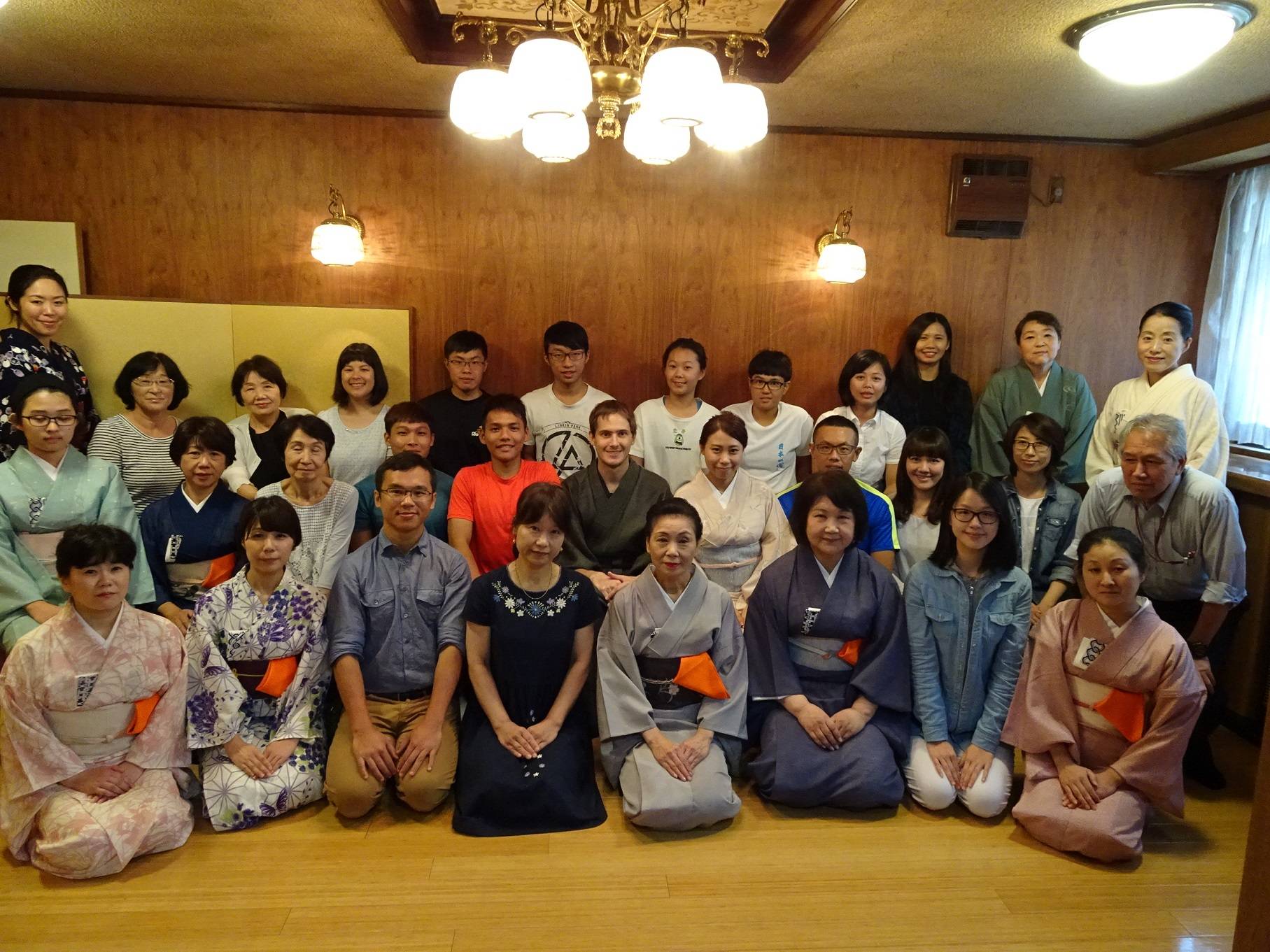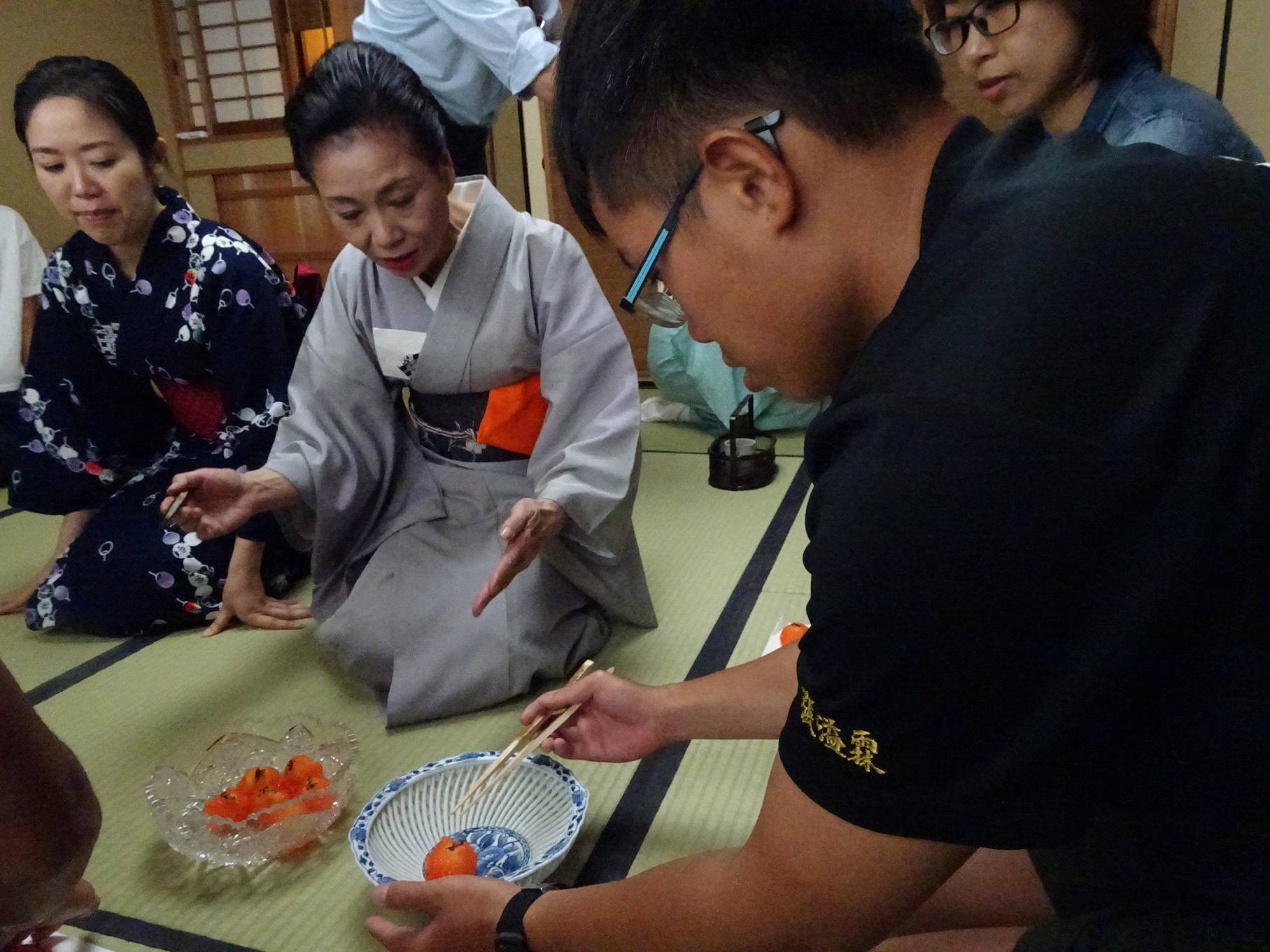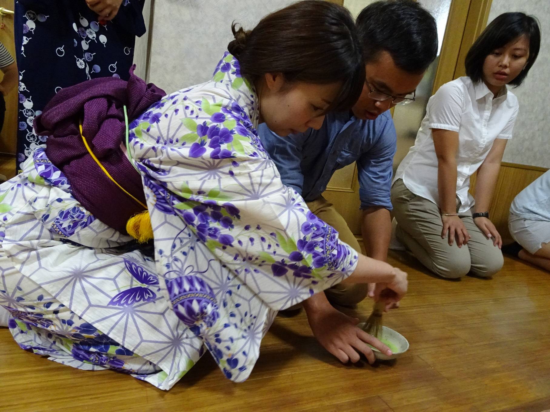 日本茶道禮節繁多,從洗手開始、穿越茶室入口小門、到用筷子夾取茶點、品茶、奉還茶碗都有一定的禮儀動作,甚至室內陳設擺飾也應季節而有所變化,來自台灣的老師們努力跪坐聽取說明,既緊張又興奮地體驗茶道。茶道體驗後,兩人一組學習如何點茶,茶筅攪拌碗中茶水直至茶湯泛起泡沫看似簡單,實際操作卻不容易。浜田宗富說明日本茶道分為表千家、裏千家、武者小路三大流派,打出豐富細密、覆蓋茶水表面的泡沫是裏千家的特色。最後,浜田宗富還準備了小小驚喜,讓猜拳獲勝的一男一女體驗穿和服。