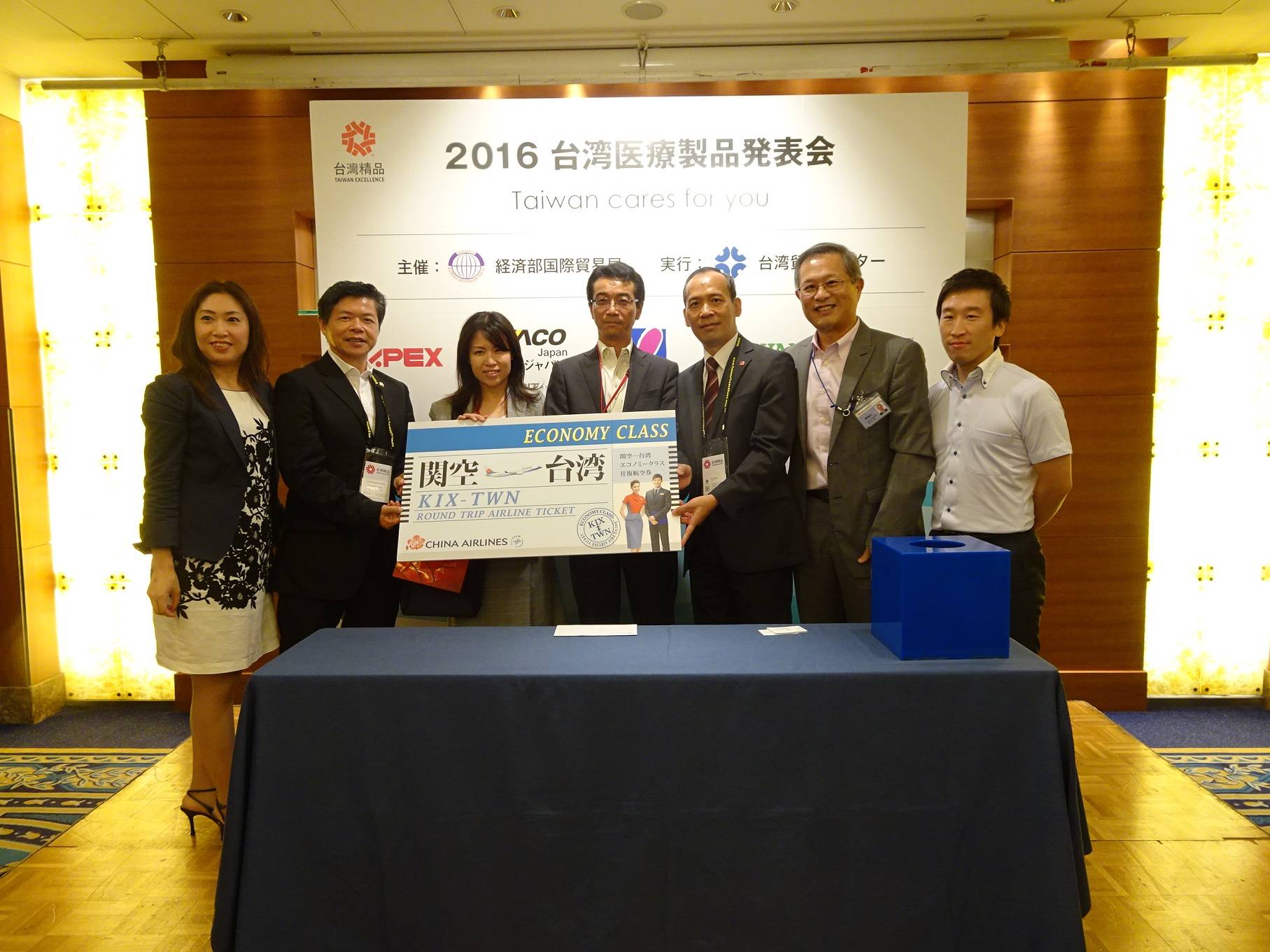 交流會上、中華航空大阪支店支店長孫鴻文(右2)贈送兩張商務艙來回機票,並對到場廠商提供行李重量優惠服務。