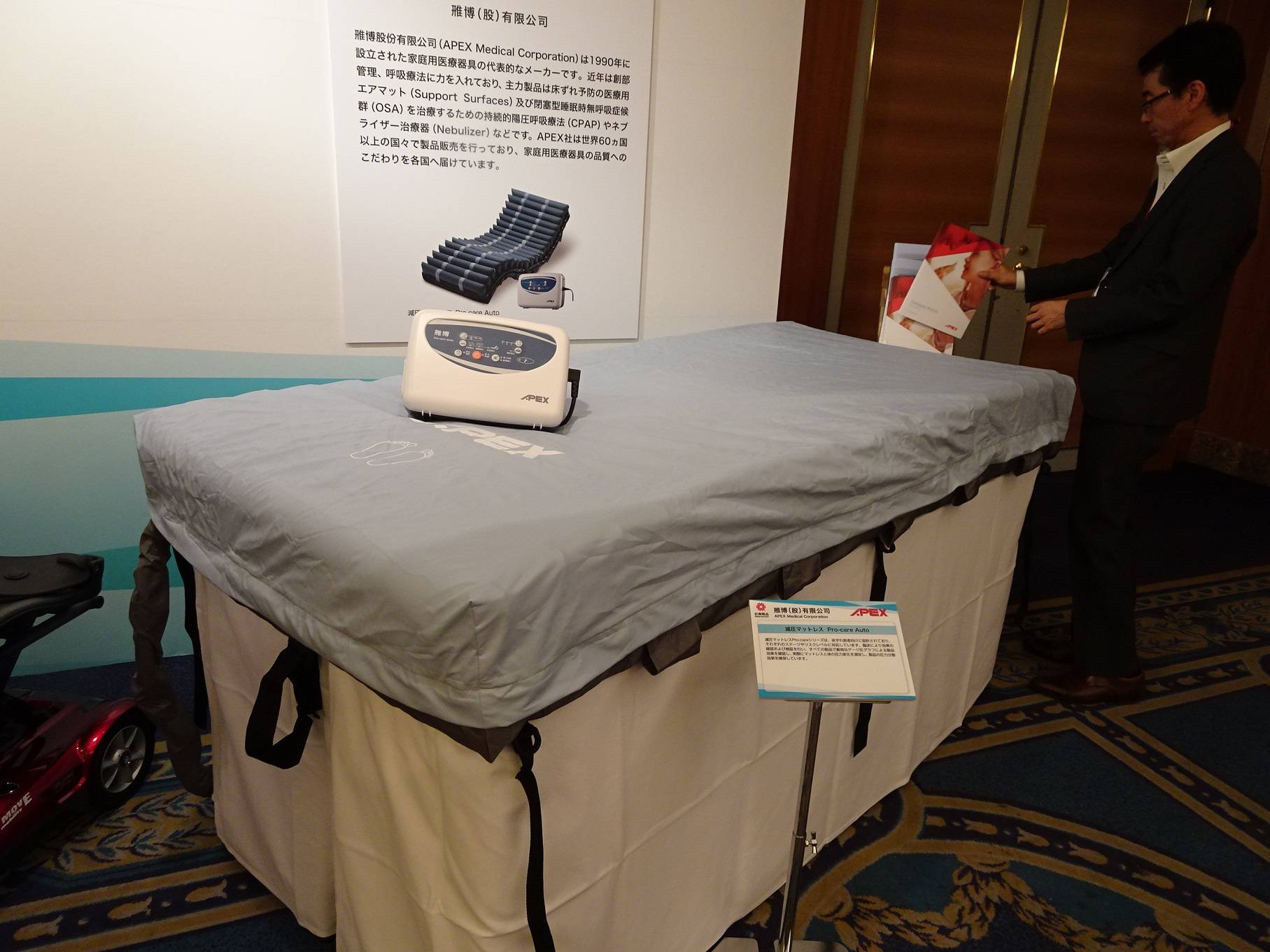 經濟部國際貿易局主辦、台灣貿易中心協會執行的「2016台灣醫療製品發表會」於7月20日在大阪瑞士大飯店舉行,雅博股份有限公司、岱宇國際股份有限公司、台灣維順工業股份有限公司、上銀科技股份有限公司及百略醫學科技股份有限公司等5家公司發表最新醫療器材產品(包括減壓氣墊床、復健用訓練腳踏車、小型折疊式代步車、沐浴輔助機器人、診間專用血壓計等),吸引媒體和近百位廠商到場。