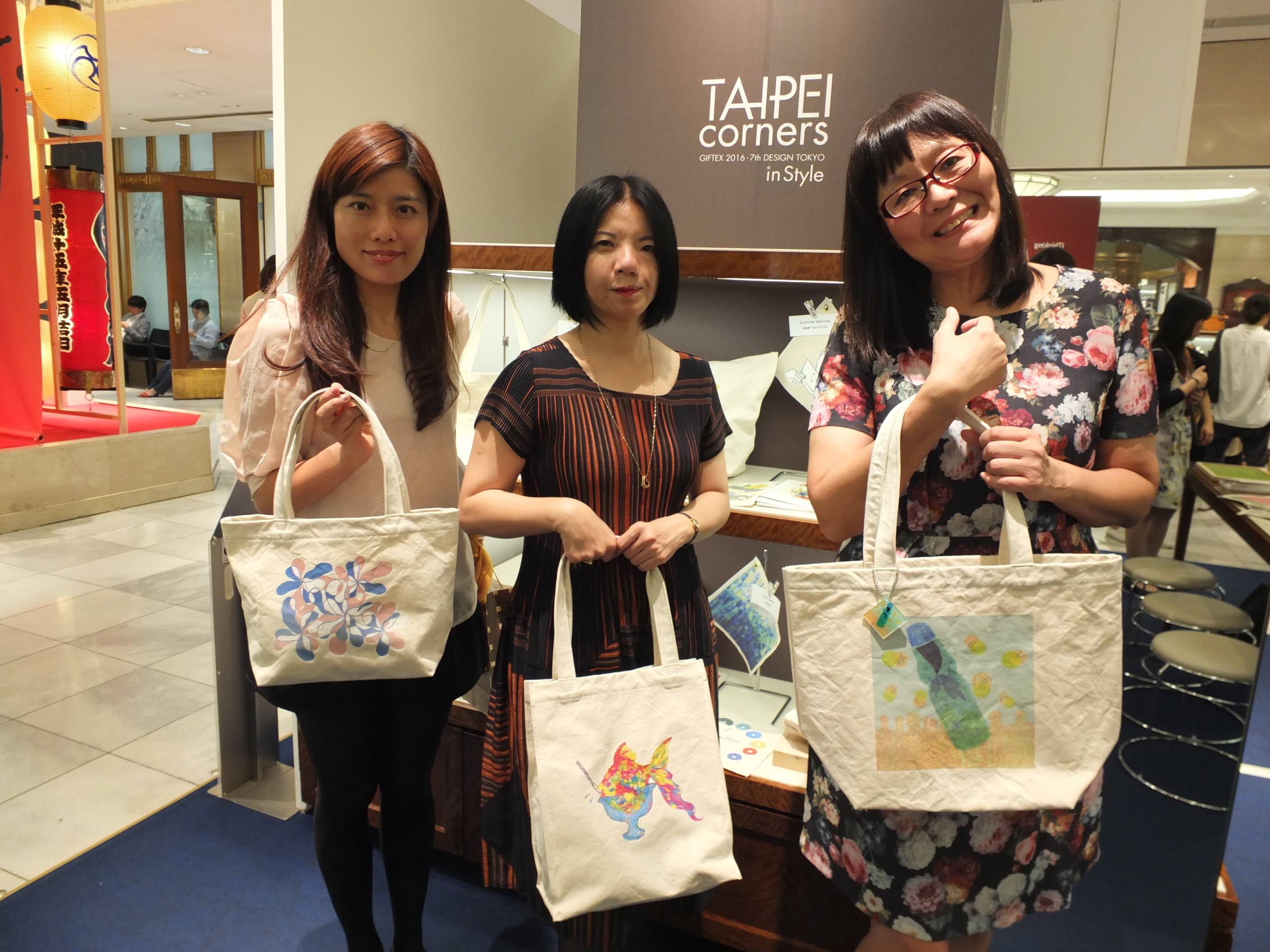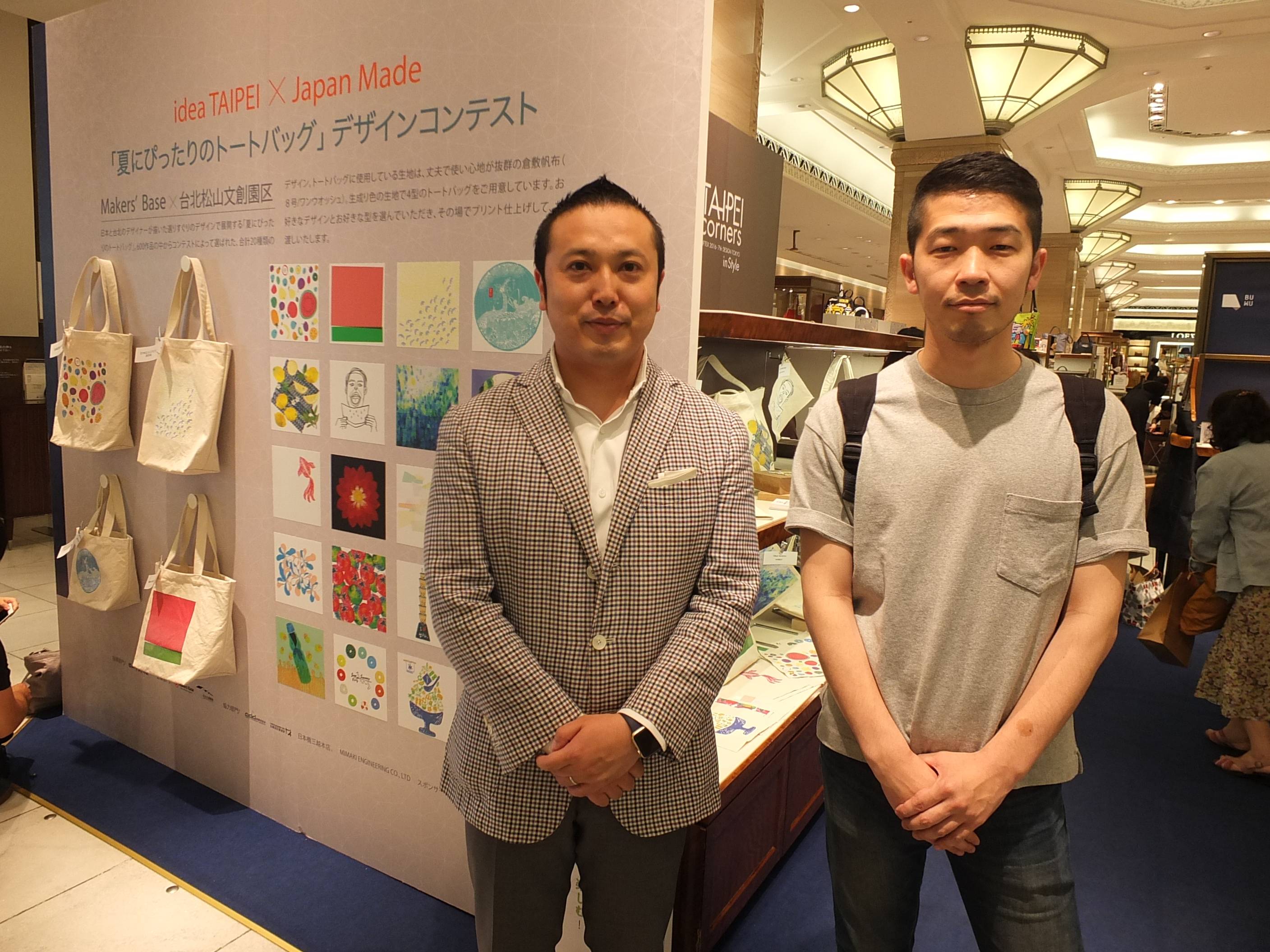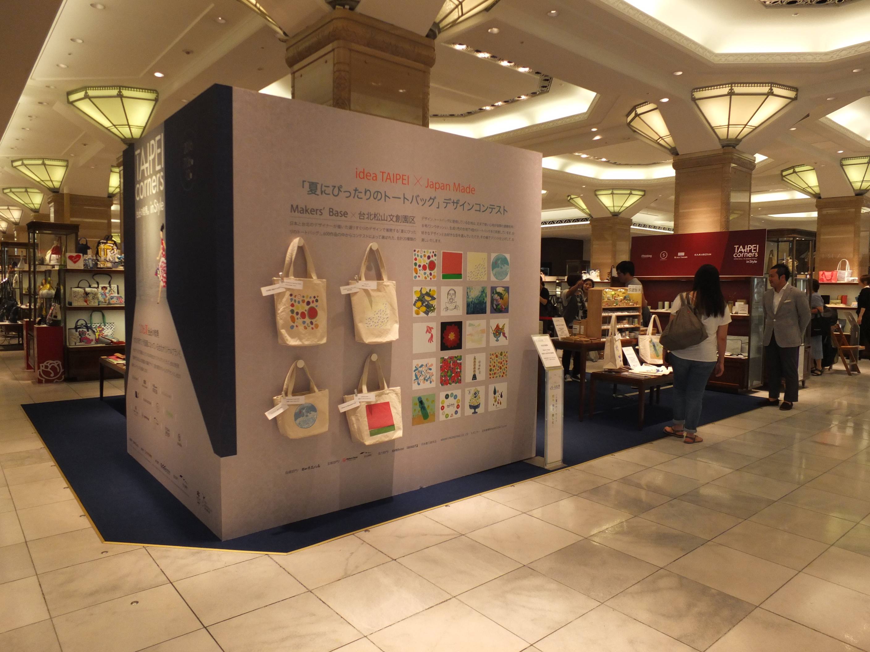 三越バックコーナーの一角に設置された展示ブースでは、台湾最新プロダクトの展示のみならず、日本のデザイン会社であるMakers’Baseと連携して行われた「夏にぴったりのトートバック」コンテストで600のデザインの中から上位20位に選ばれた日本と台湾のデザイントートバックの企画も行われている。