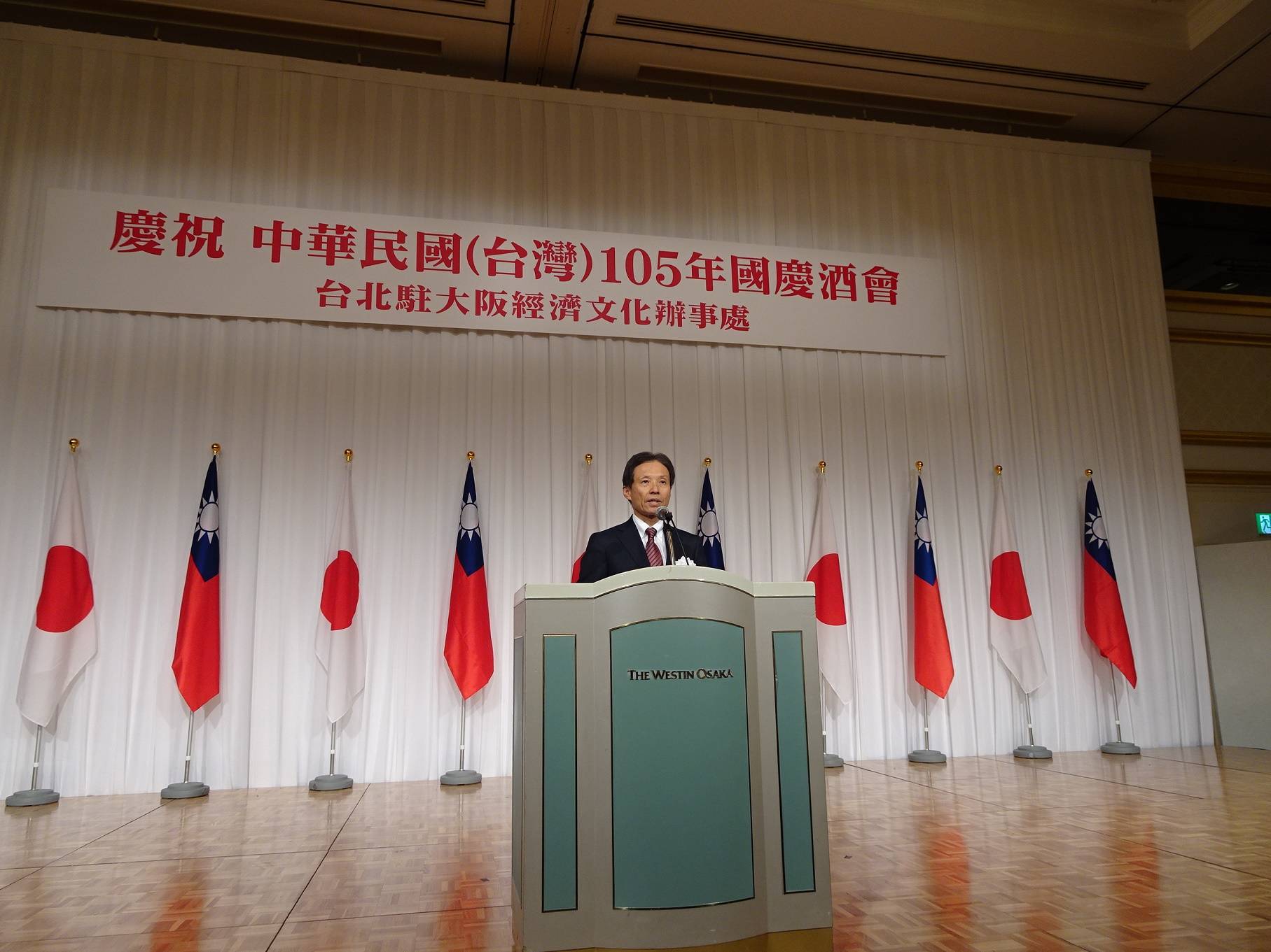 駐大阪辦事處於10月7日在大阪威斯汀飯店舉辦中華民國105年雙十國慶酒會,眾議員鈴木克昌、中山泰秀、大阪府議會議長今井豐、轄區各地日華親善團體、僑領、僑胞近千人到場,場面隆重盛大。