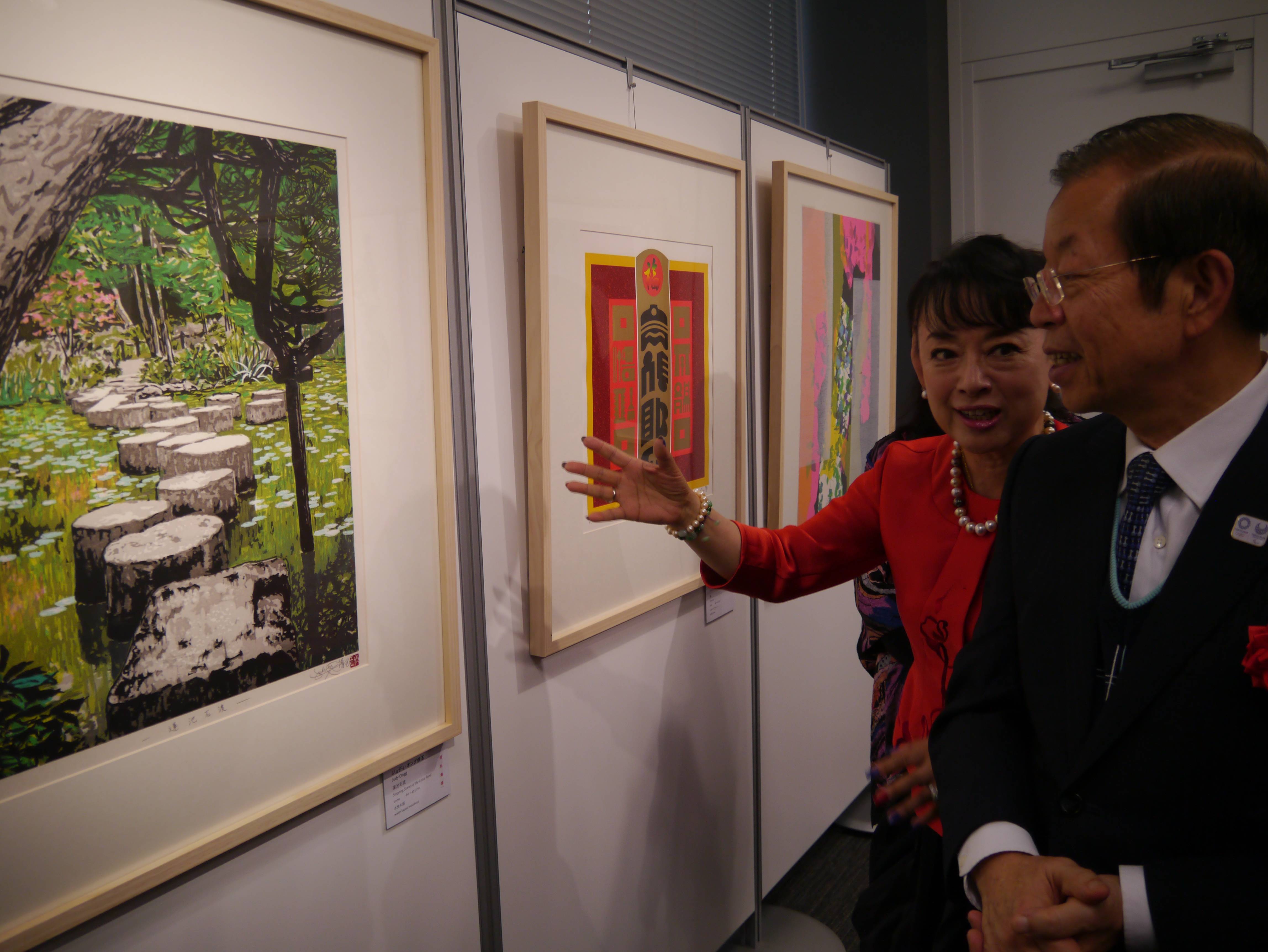 身兼歌手與版畫家的翁倩玉向駐日代表謝長廷介紹自己的作品