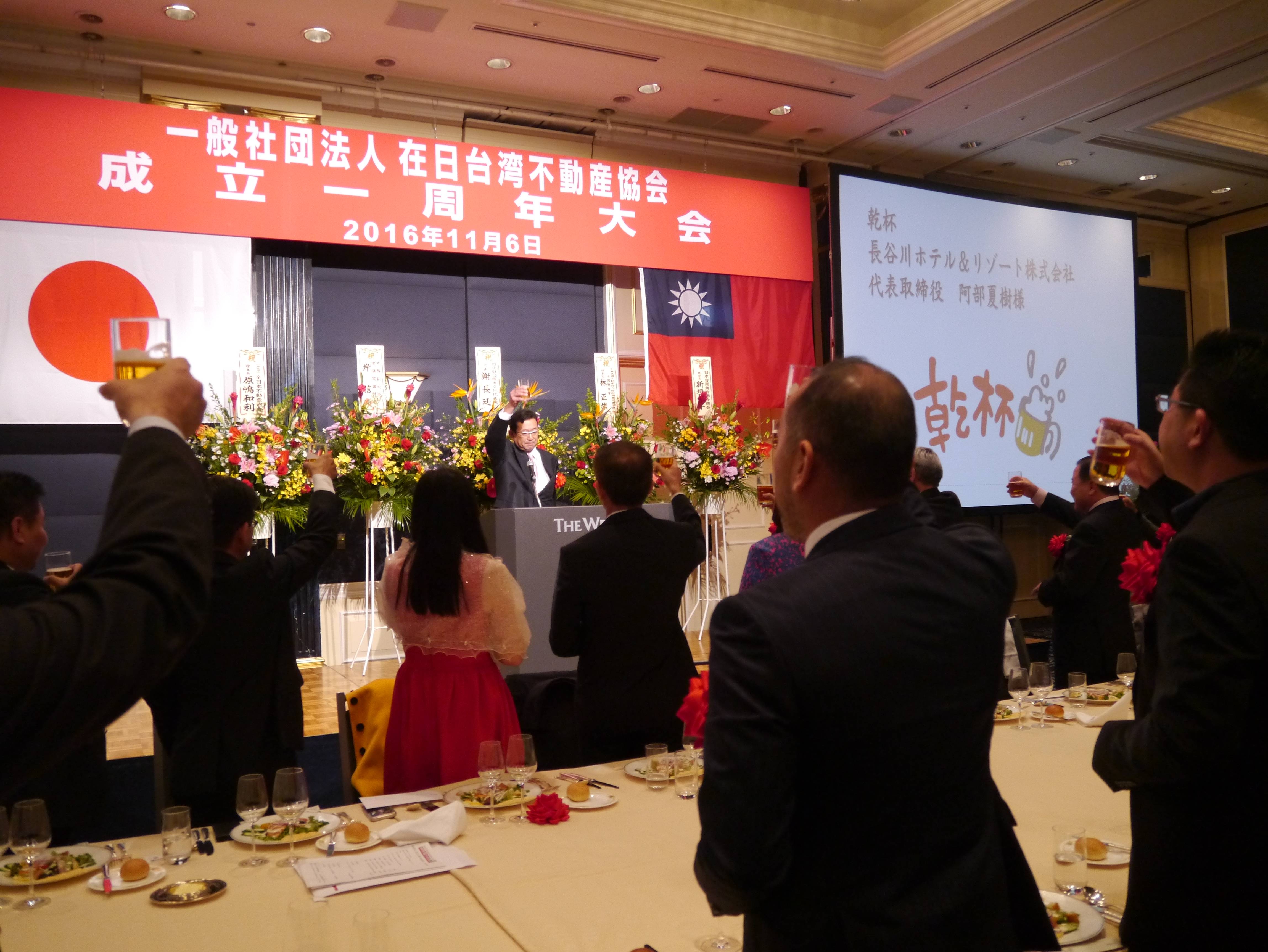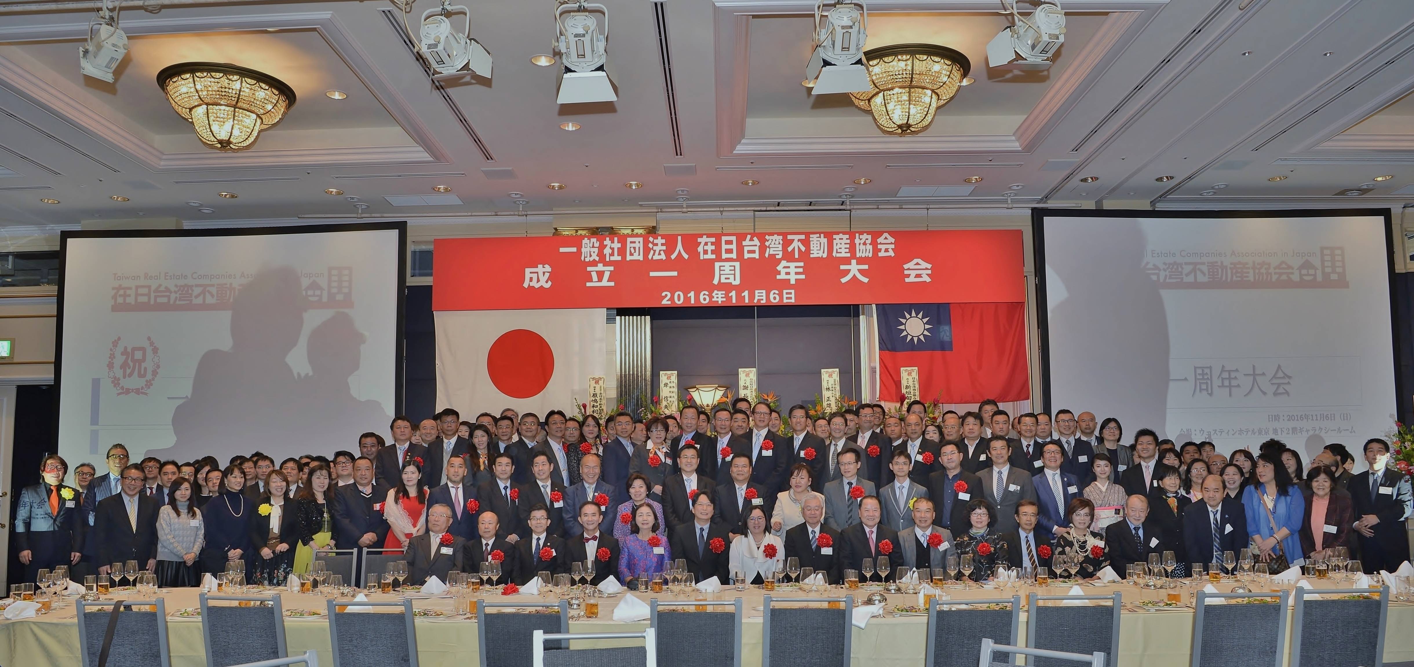 在日台灣不動產協會於11月6日在東京舉行一周年大會,駐日代表處副代表張仁久、在日不動產協會最高顧問詹德薰、全日本不動產協會理事長原嶋和利和中華民國不動產仲介經紀商業同業公會全國聯合會理事長林正雄等來自台日兩地200多位嘉賓,出席當日大會。