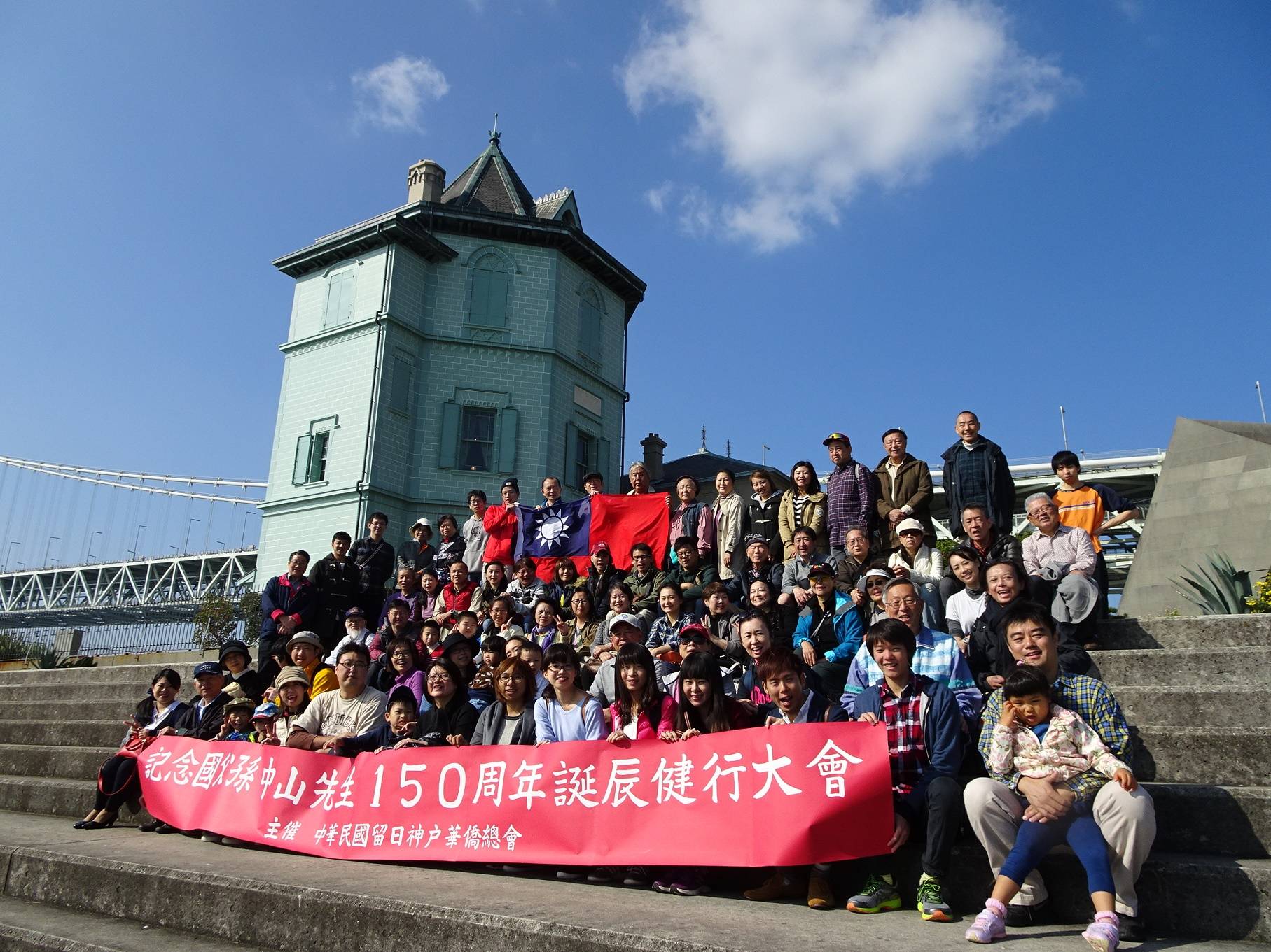 為紀念國父孫中山先生150歲誕辰,神戶華僑總會在11月12日國父誕辰當天,舉辦從位於「舞子」的孫文紀念館走到總會會館所在地「三宮」的健行活動,獲得京阪神地區僑胞、留學生約百人熱情響應,駐大阪辦事處僑務組組長黃水益、秘書羅國隆、蕭宗欽等同仁也偕家人到場共襄盛舉。
