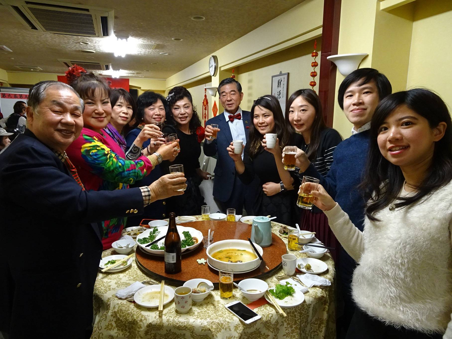 當晚舉辦歲末親睦餐會,駐大阪辦事處組長黃水益、秘書羅國隆代表因公務不克到場的處長陳訓養向大家致意,感謝大阪台灣同鄉會一年來積極舉辦活動聯繫僑胞情誼,9月台灣歌仔戲來日公演時,大阪台灣同鄉會包車遠征石川縣加賀市捧場,愛鄉情操及為台日交流所做的努力,令人感動,祝大阪台灣同鄉會會務蒸蒸日上,也懇請大家繼續與駐館一同為台日關係向前邁進。