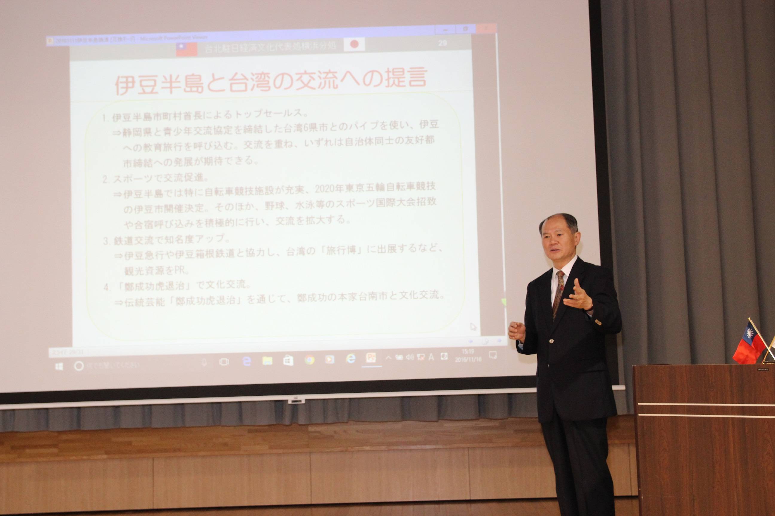 橫濱辦事處處長粘信士夫婦應靜岡縣議會議連會長森竹治郎之邀,於11月16至17日前往南伊豆町拜會,以「台日關係與地方交流」為題進行專題演講,對南伊豆町和台灣交流提出建議,並參觀當地避難高台的設施。