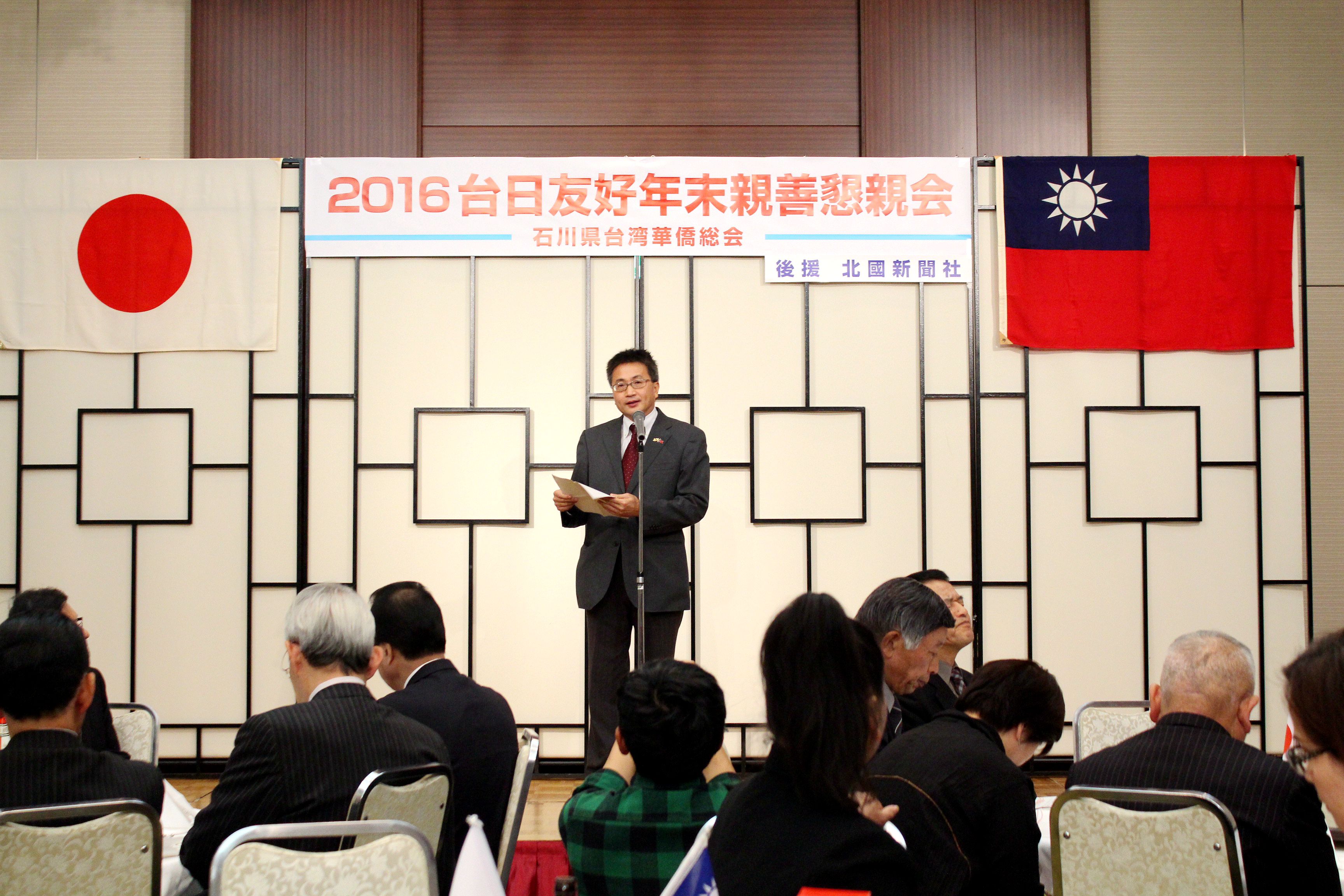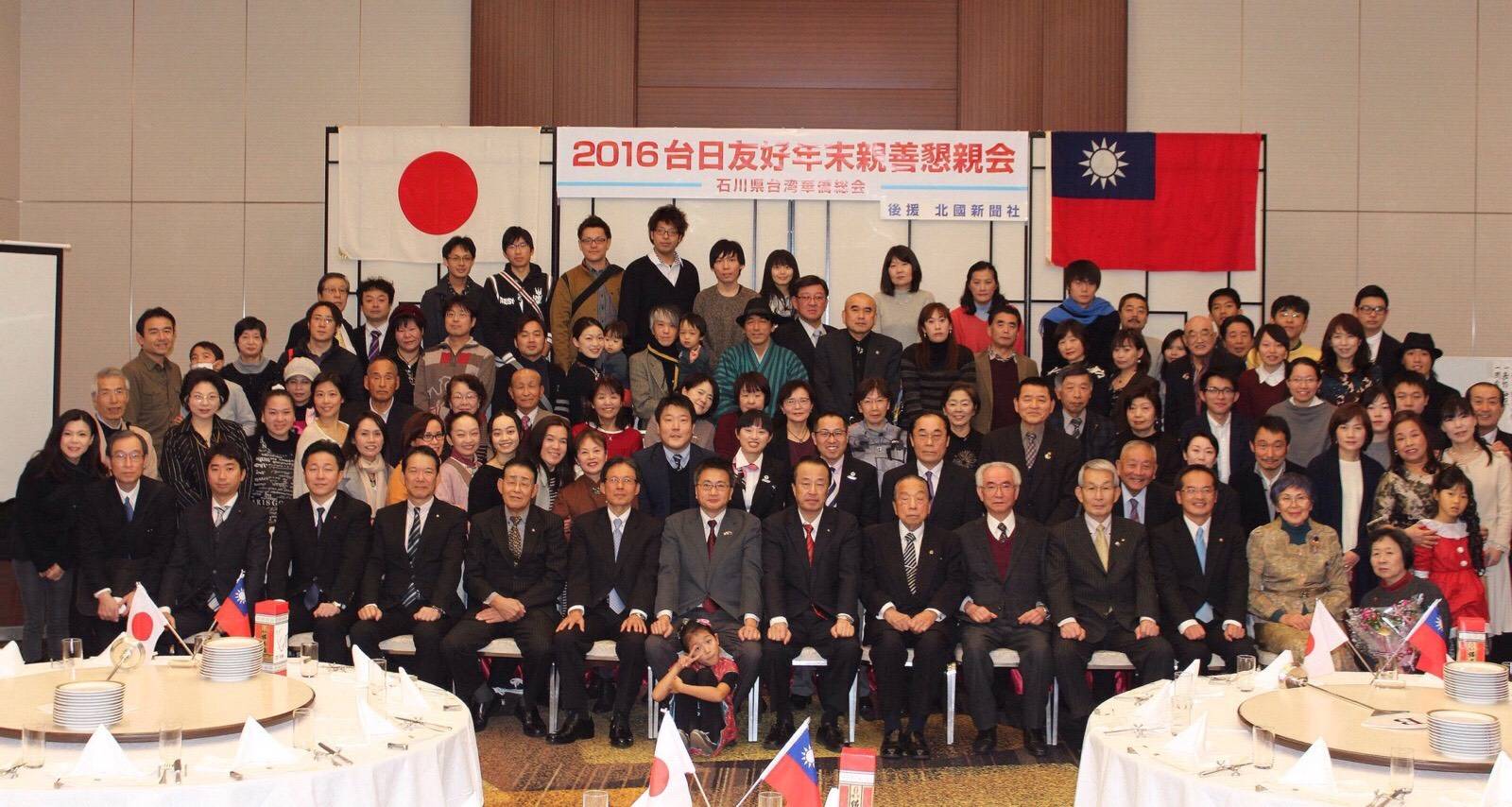 由石川縣台灣華僑總會所舉辦的「2016年台日友好年末親善懇親會」,於12月11日在金澤東急飯店舉行,共有120多位來賓參加,駐大阪辦事處處長陳訓養、金澤市長山野之義和加賀市長宮元陸、石川縣日華親善協會會長長井賢誓也都受邀出席。