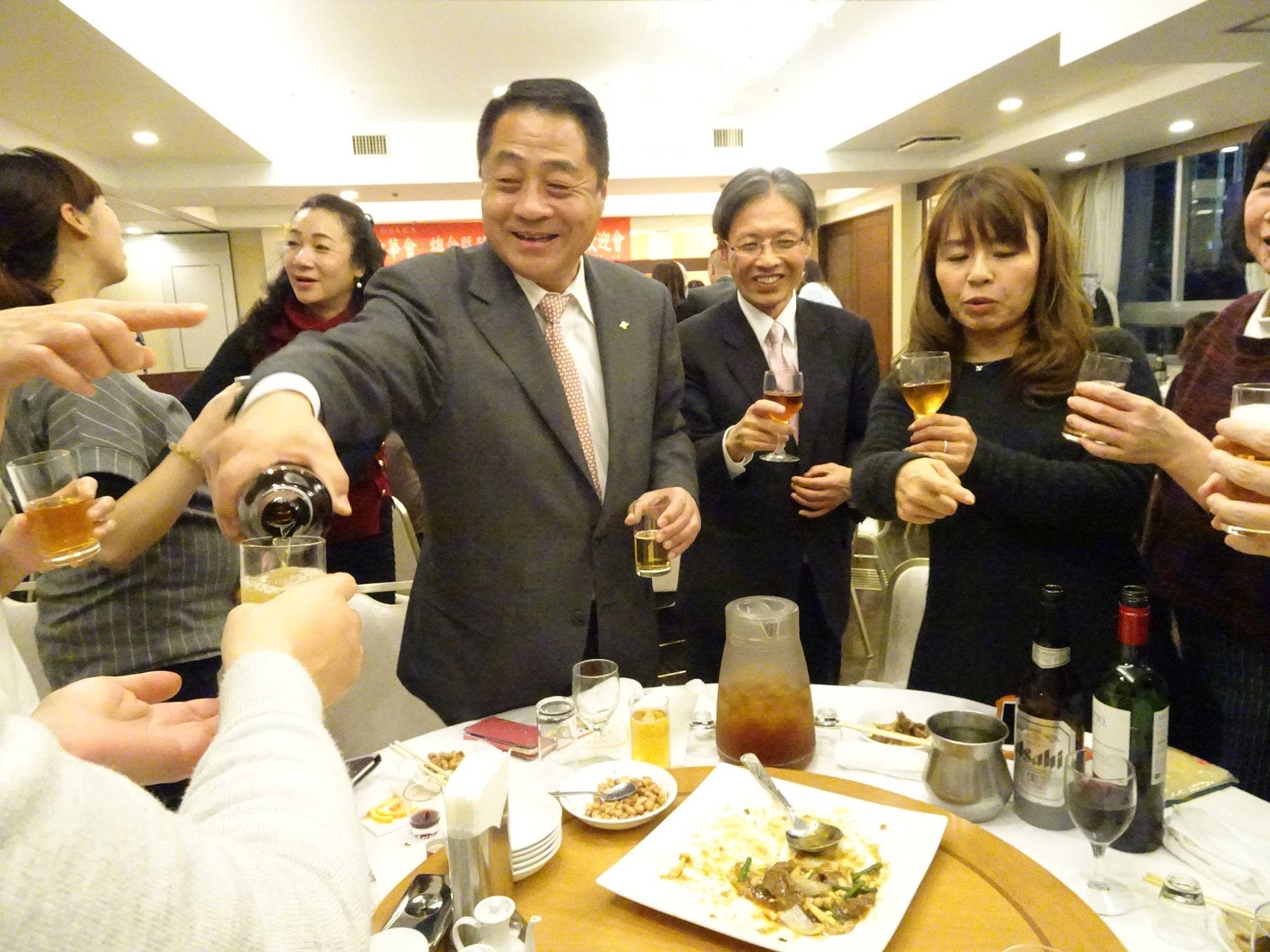 會長李忠儒向陳處長介紹該會由大阪中華學校教職員、在校生及畢業生家長為主所組成,在海外逢年過節共度、相互扶持關懷是創會的最大目的。李忠儒向大家拜晚年,元宵雖然沒有湯圓,特別請餐廳準備水餃,每桌有一位有機會吃到中獎的元寶水餃,祝福大家新的一年好運連連、家庭事業圓滿團圓。