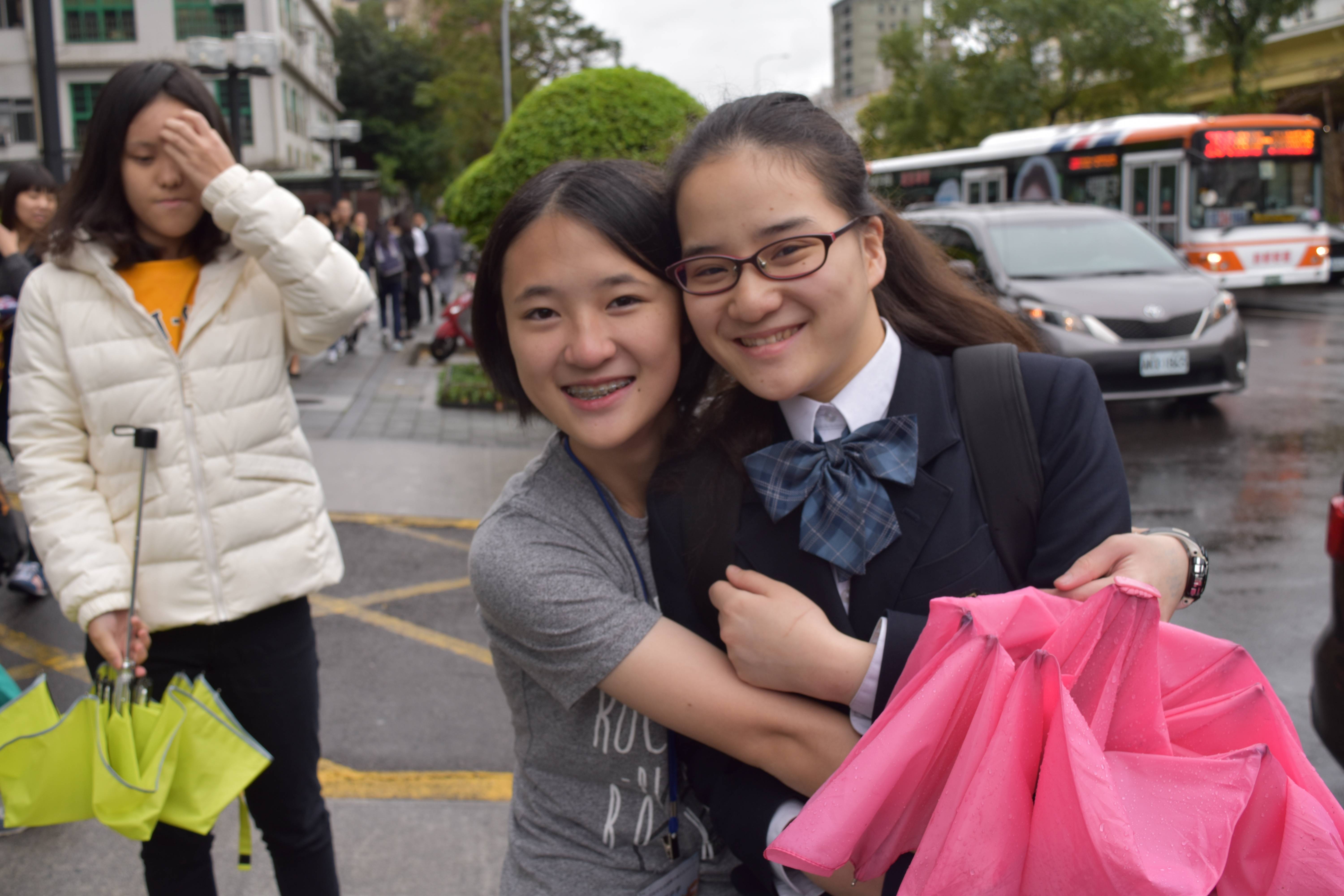 別れを惜しむ延平高級中学ジャスミンさん(左)と藤村美碧さん