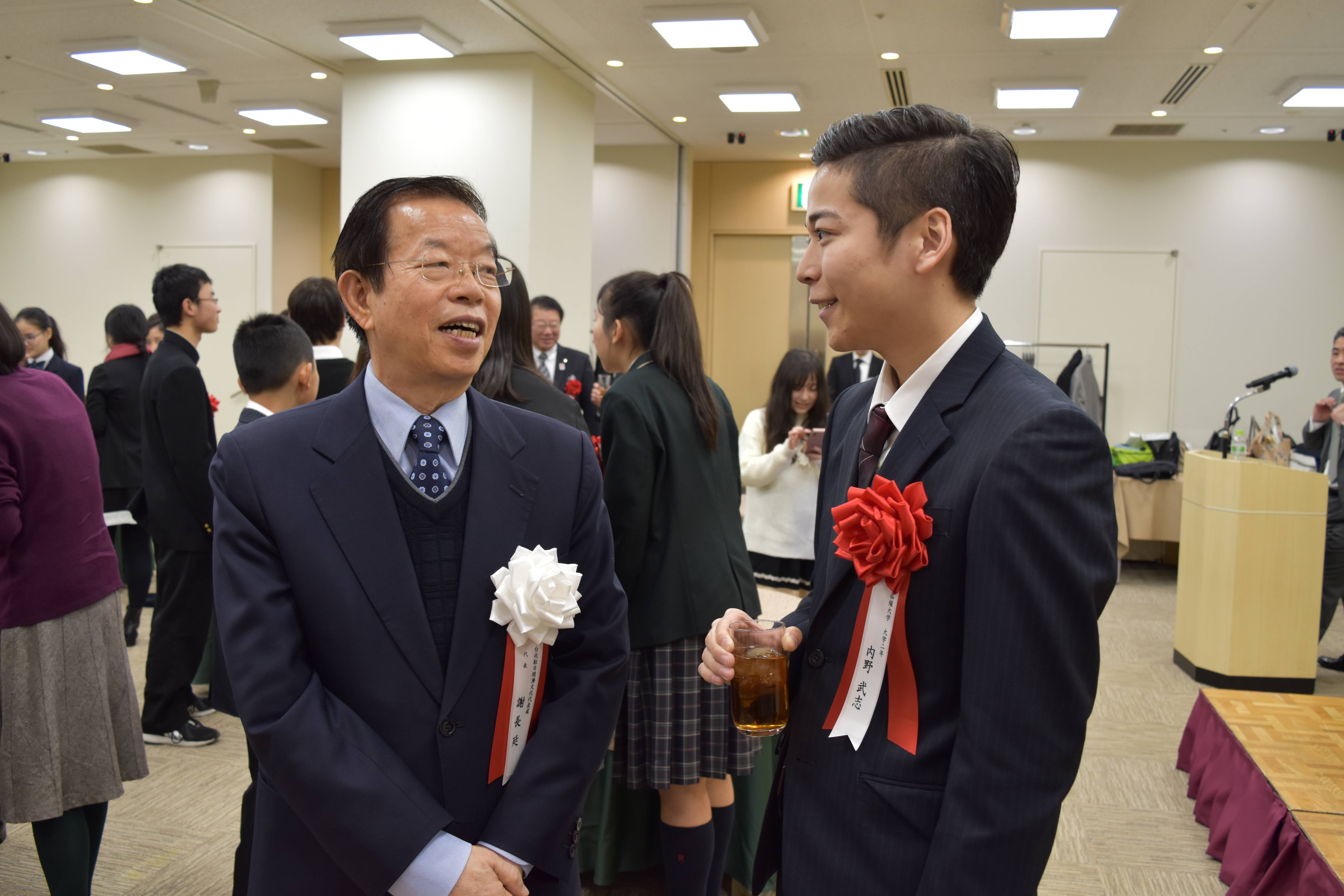 台北駐日経済文化代表処の謝長廷代表と台湾について話す拓殖大学2年の内野 武志くん