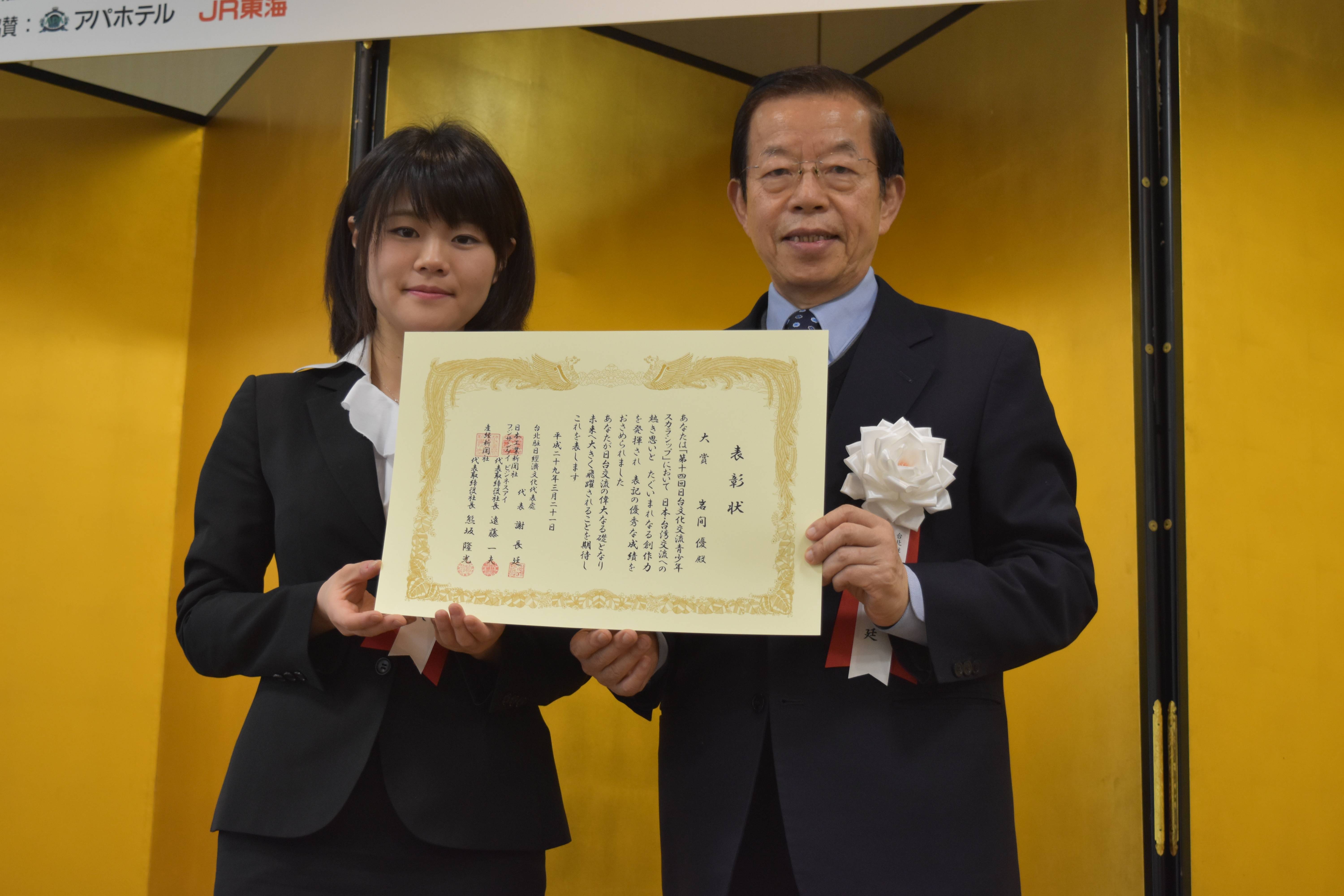 出発日の21日午前には、東京都千代田区のサンケイプラザで表彰式が行われ、台北駐日経済文化代表処の謝長廷代表らも出席。謝代表は、「受賞者らが将来、台湾と日本の友好交流の懸け橋となり、台湾の若者と共に国際社会に貢献できるように期待している」と話し受賞学生らを激励した。