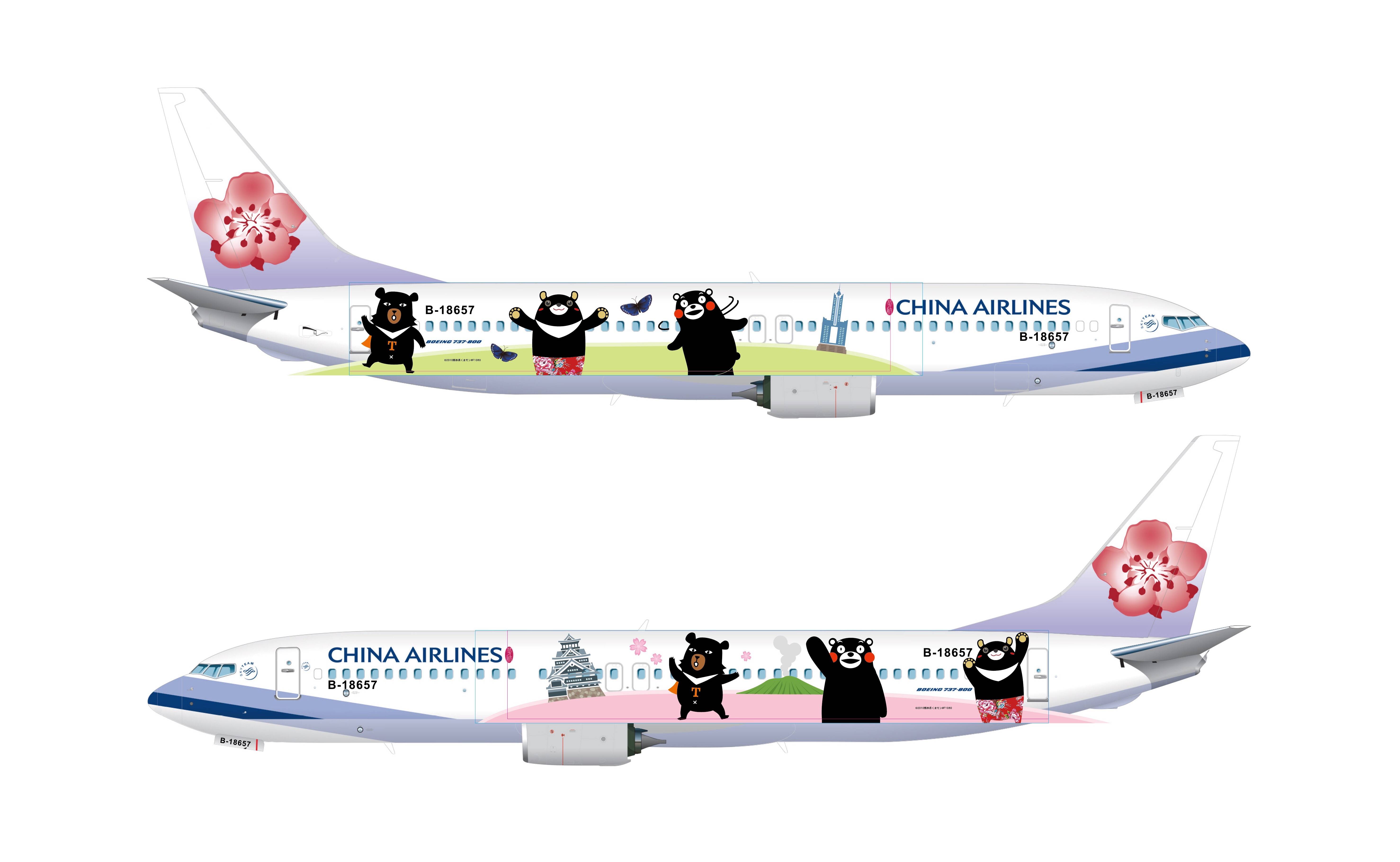 特別機の機体には、台湾観光局の「喔熊(オーション/オーベア)」、高雄市政府の「高雄熊(ガオションション/ヒーロー)」、日本熊本の「くまモン」の“三熊”が塗装され、「三熊 一緒にPLAY」をコンセプトに、機体右側面には台湾の春の芝生、台湾高雄で最高層の85スカイタワー、紫斑蝶。左側面には九州の春の美しい桜吹雪の景色とともに、400年以上の歴史を誇る熊本城や阿蘇山が描かれる。また、くまモンが国際線にデザインされるのは初めてだという。