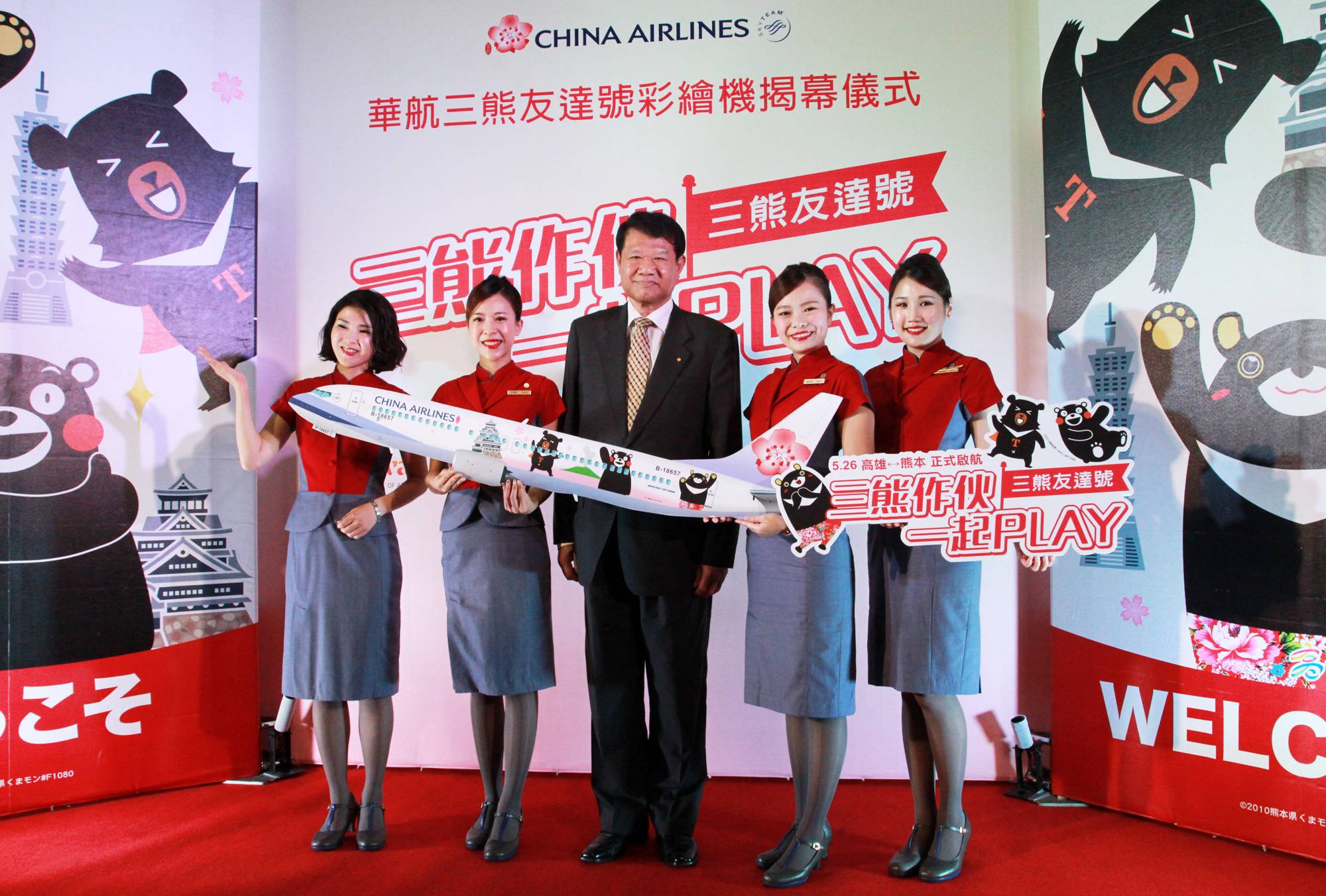 チャイナ エアライン(本社:台湾桃園市、取締役会長:何煖軒、CAL/CI)は4月19日、台湾観光局、高雄市政府、熊本県との提携によるB737-800特別機「三熊友達号」を発表した。初便は5月26日、高雄-熊本線に就航する。