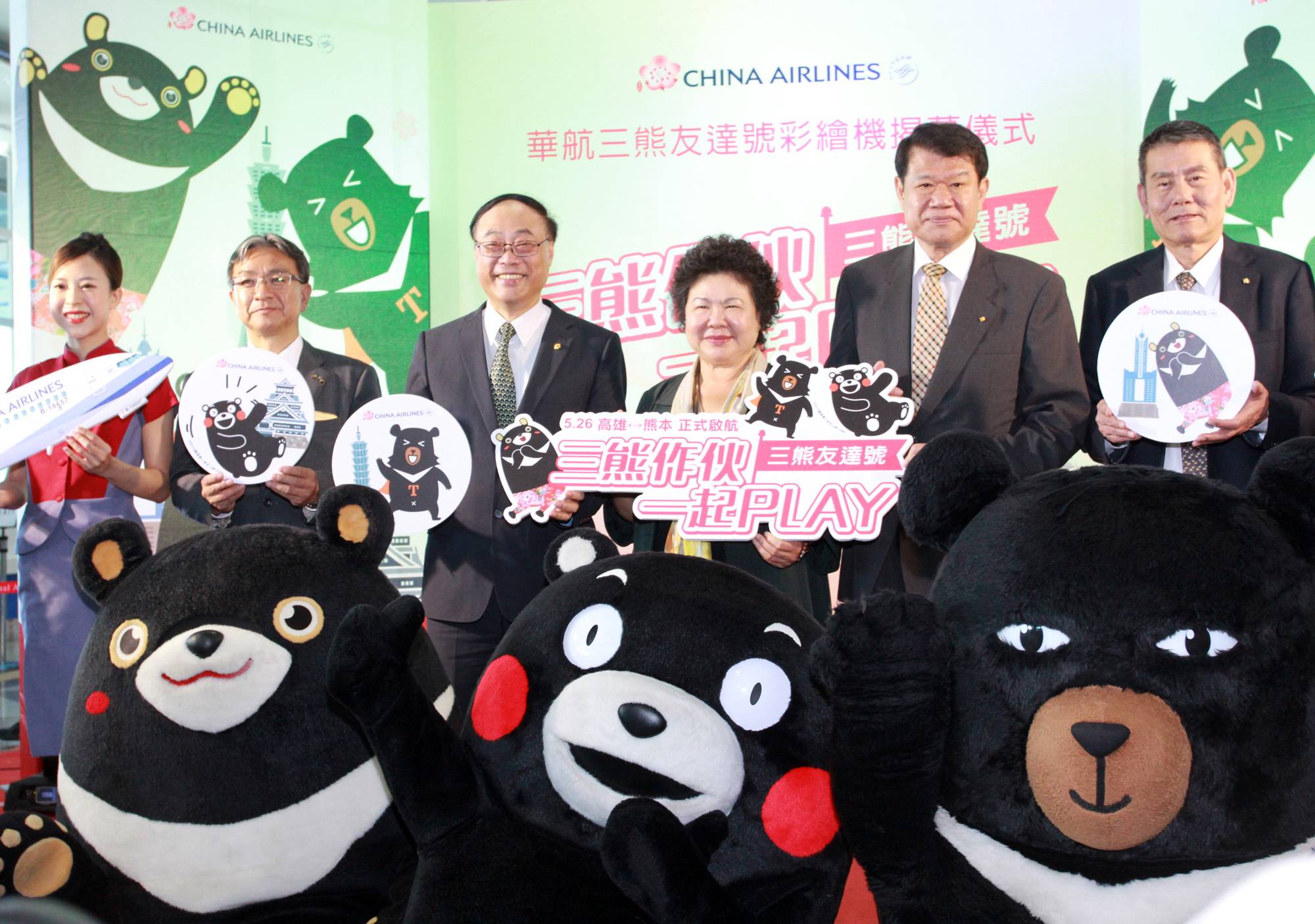チャイナエアラインは19日、高雄市内で特別機「三熊友達号」発表の記念イベントを開催し、陳菊市長らが出席した。また、震災復興から1年を迎えた熊本県の蒲島郁夫知事もテレビ電話で参加し、台湾による震災支援について感謝を述べた。これについて高雄市政府の陳菊市長は、台湾国民を代表して熊本並びに近隣地域の再建を応援している旨を伝えた。