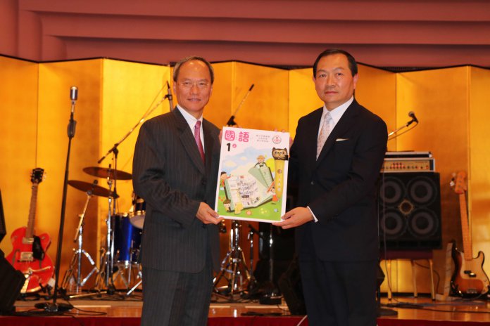 僑務委員會委員長吳新興(左)將橫濱中華學院編寫、僑委會共同出版的《親子共學華語父母手冊》,贈予校長馮彥國