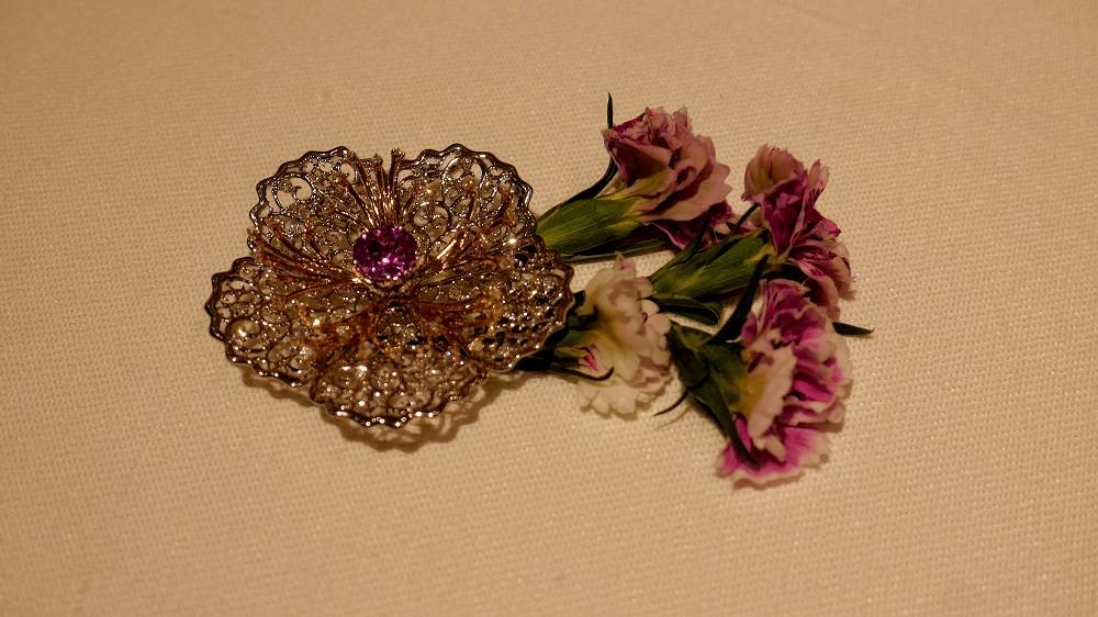 本次特別邀請七位年輕女性珠寶設計師參與,使用比以往白金亮度更高、硬度更高的「Koo-fu Pt 950」合金,設計出多款纖細精美的珠寶作品。其中中嶌杏子的作品「bloom」,纖細的線條展現了職人的高度技術,搭配鑽石與寶石,華麗又可愛,彷若花朵盛開般充滿生氣。