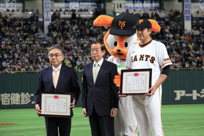 試合前に行われた贈呈式には、台湾を代表して台北駐日経済文化代表処の謝長廷代表が出席し、義援金の目録を受け取ったほか、謝代表からは石井一夫球団社長と菅野智之選手会長に感謝状を贈呈した。
