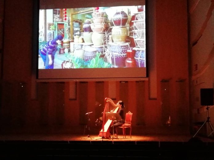 当日は、九份、花蓮、蘇澳など台湾にある11箇所の美しい風景映像に合わせ、彩さんがハープを奏でた。日本歌曲「故郷」や台湾歌曲「望春風」など日本と台湾において馴染みが深い歌曲のほか、彩さん自身が作曲した映画3作品のテーマ音楽全19曲を披露した。