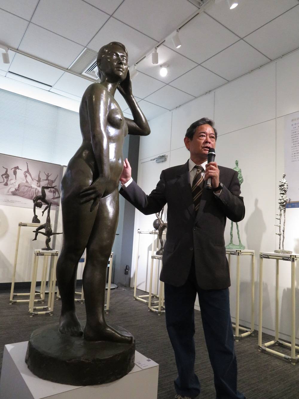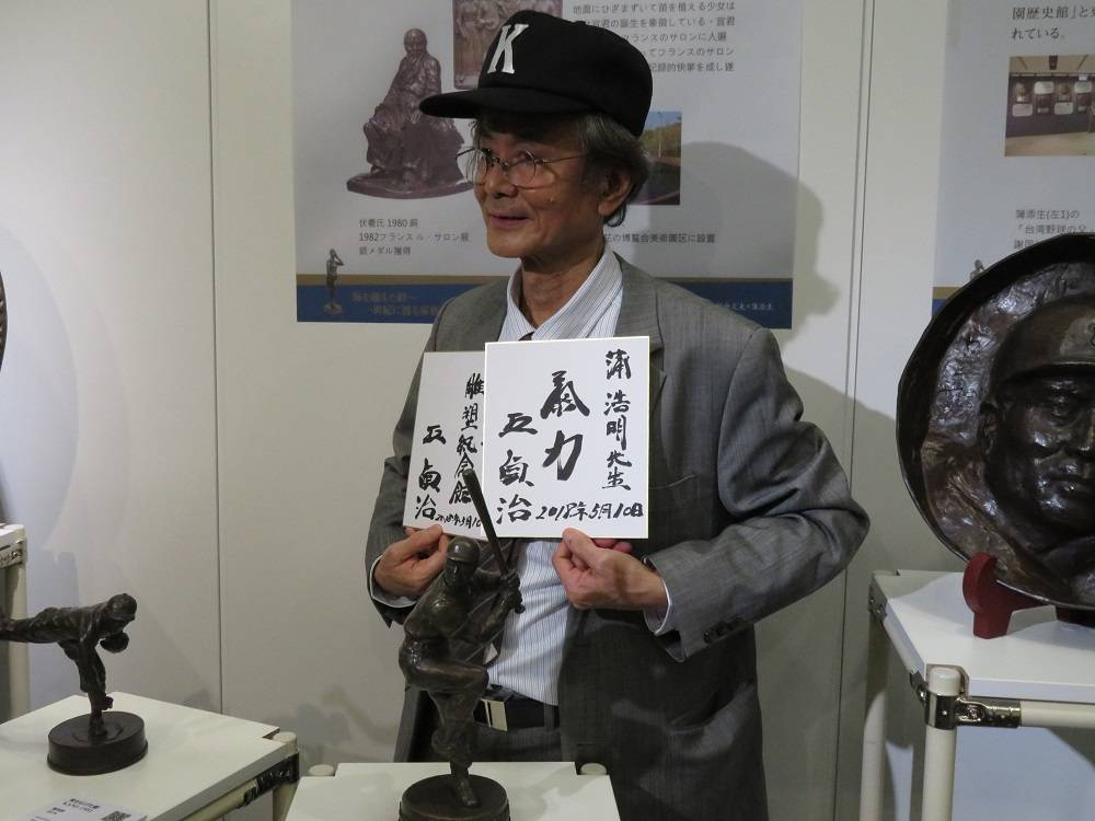 蒲添生的三男,蒲添生雕塑紀念館館長蒲浩志,在現場解說展場的作品,包括特別商借來朝倉老師的,牛,兔,貓,對照蒲添生的相同題材,朝倉老師女兒朝倉響子的現代女性雕塑,其他包括蒲添生的體操,棒球相關題材,旅日棒球名人王貞治特別在展前來到會場,觀賞作品,並留下簽名致意。