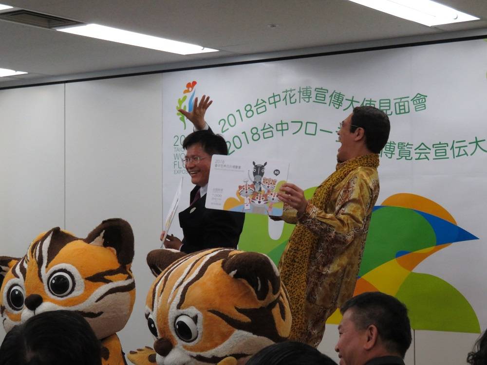 在台灣年底六都選情緊繃時期,台中市長林佳龍率領台灣媒體,市府局處官員及台中市議員等藉台中東京直航機會,來日宣傳十一月三日開始的花博。市府邀請到創作PPAP的PIKO太郎為花博宣傳大使,他表示,上周才去台灣,台灣不僅有鳳梨酥,還有鳳梨蘋果汁,跟PPAP搭配剛剛好。林佳龍表示,PIKO太郎是日本外務省在聯合國推動永續發展目標的大使,花博也是推展永續利用,跟PIKO太郎的理念不謀而合,市府與PIKO太郎將一起打響台中花博在國際的知名度。