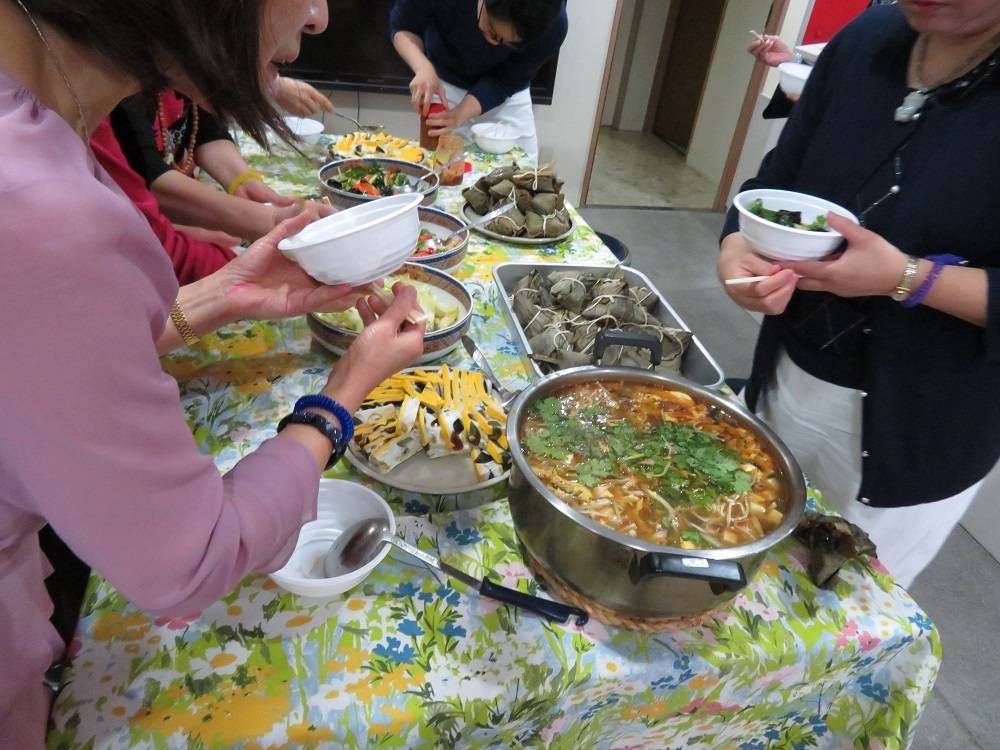 團拜之後,將近午時,大家來到媽祖廟庭院接午時水,今年端午,東京天候不佳,不過中午太陽稍稍露臉,端午的太陽有驅邪健體的效能,把握時間接陽氣,讓這一年身體健康,精氣神暢旺。在誦經之後,一起享用廟裡的素齋,及端午粽子,下午是為一些完成誦經功課的信徒,向媽祖呈報疏文,為了家人父母子女的平安,每日不間斷的修持,固定完成媽祖交代的功課,提升自己,也能看到家人的越來越好的進步。