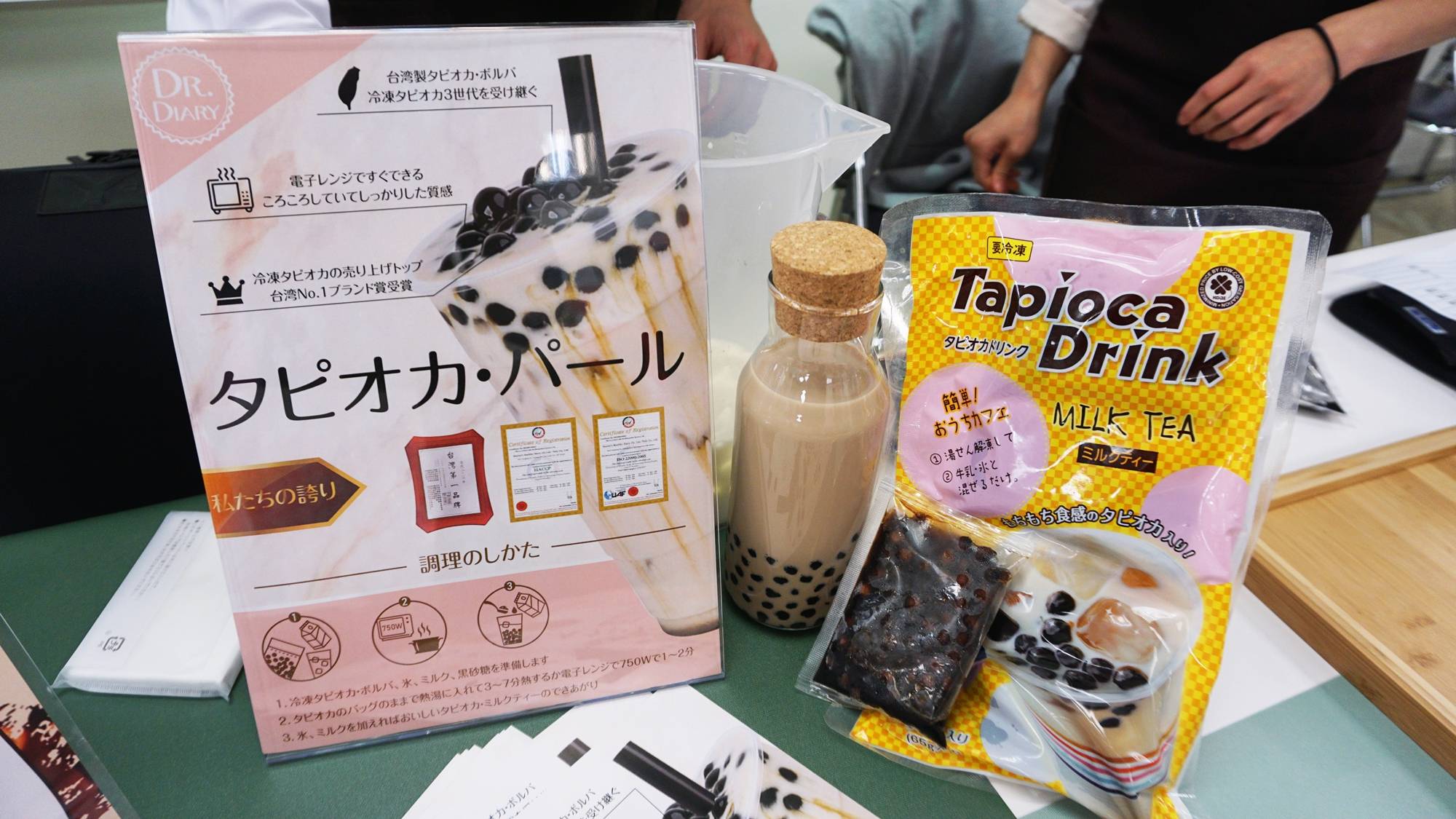 珍珠奶茶在日本熱潮不減,甚至越來越多台灣飲料店到日本開分店,但跨過海洋後,珍珠的口感跟台灣都不一樣,卜立股份有限公司在這次的展覽中就展出冷凍珍珠,不同以往以真空包裝的方式,在珍珠煮好後立刻進行急速冷凍,將味道和口感鎖住,就算再次加熱,吃起來也像現煮的一樣,而卜立也把紅茶的濃縮汁加入包裝中,消費者只要隔水加熱後,再加入牛奶就能喝到珍珠奶茶。