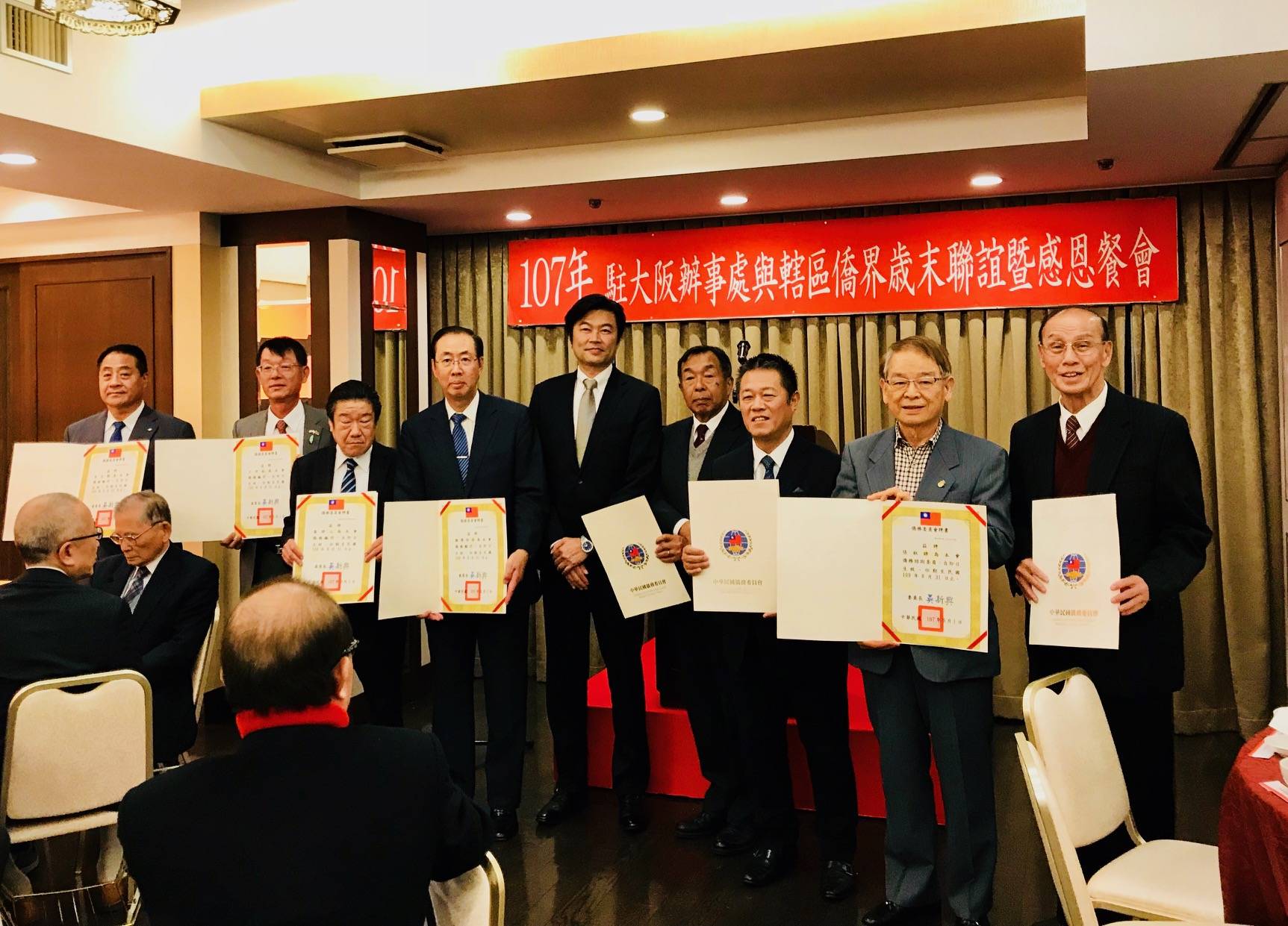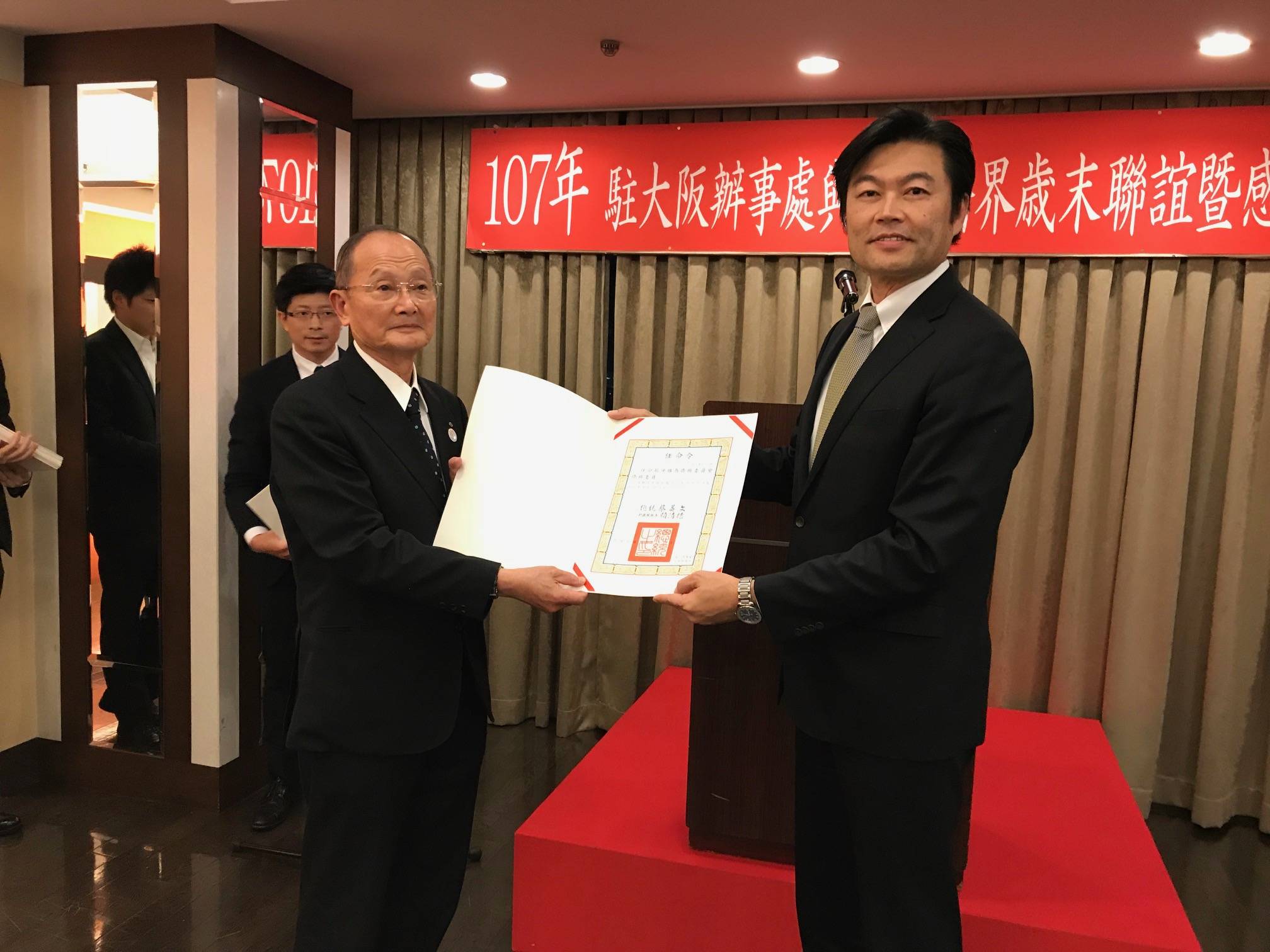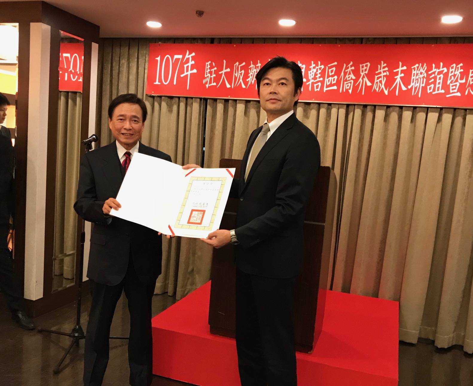 接著李世丙處長頒發由蔡英文總統任命的僑務委員證書,給大阪中華總會副會長蔡伸雄(連任)和王輝生醫師(新任),王輝生醫師是首次擔任僑務委員,他是京都大學醫學博士,目前是滋賀縣的婦產科開業醫師,王醫師熱心奔走台灣正名運動,也是促成2001年李登輝前總統赴日的重要人物之一,曾獲頒外交部的外交之友貢獻獎。