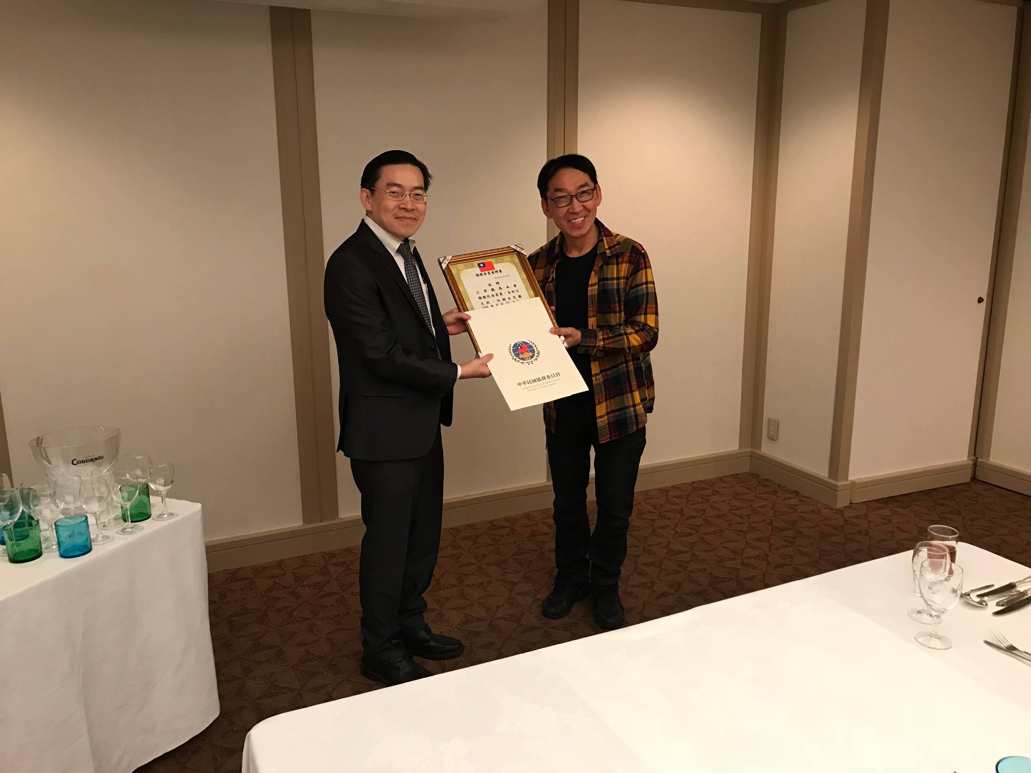 【那霸/綜合報導】那霸辦事處於十二月十九日在那霸市Harborview飯店舉辦沖繩地區僑務委員暨僑務促進委員聘書頒贈典禮。出席者有僑務委員黃美卿(新垣旬子)、僑務促進委員王澤龍(中山龍二)、汪麗莉(福本麗莉)及張本肇。由處長范振國逐一頒贈聘書予各委員,並舉辦餐敘就僑務推動工作交換意見,討論熱絡、氣氛融洽。