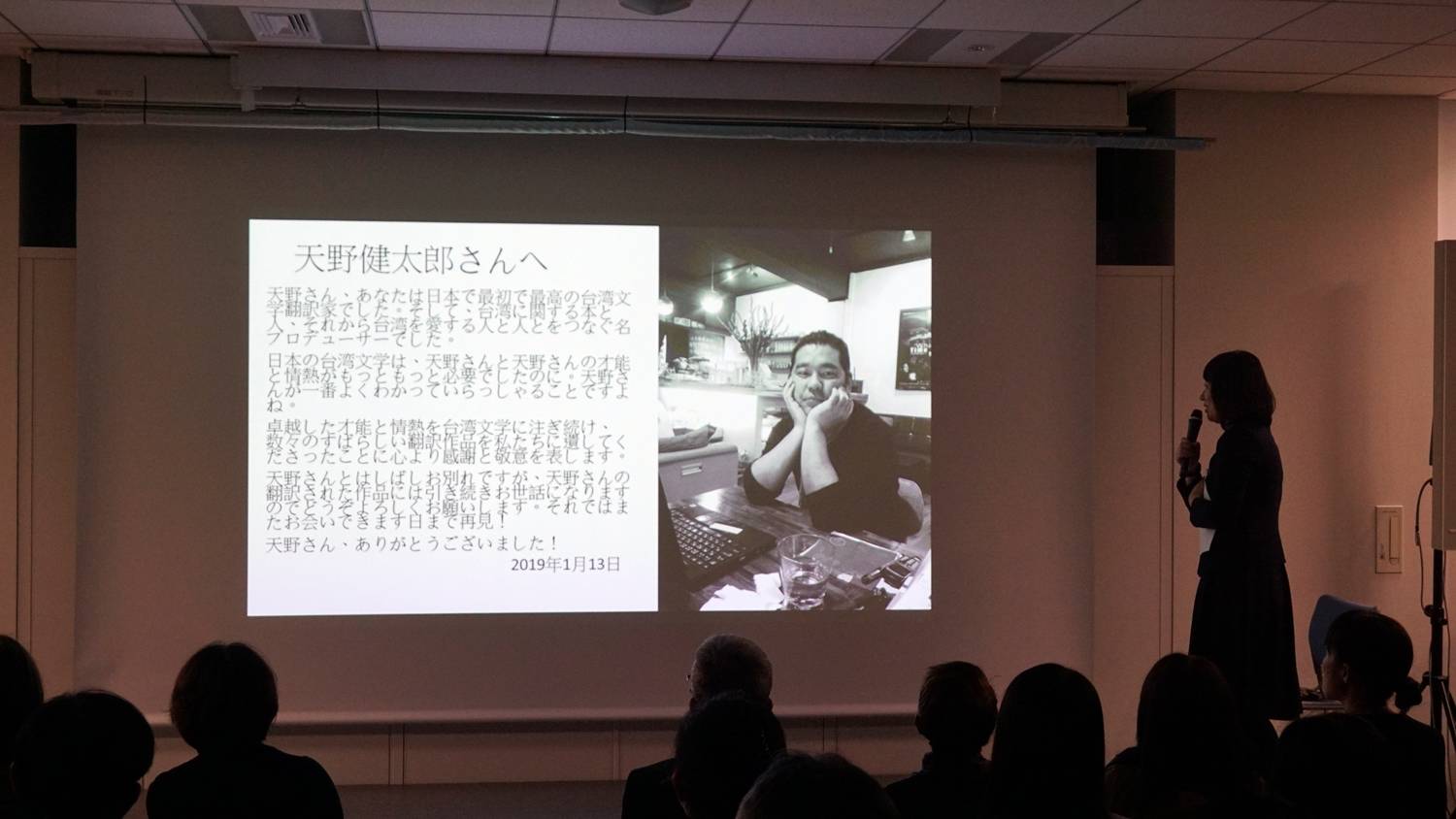 【東京/採訪報導】在台日文學界付出許多貢獻的翻譯家天野健太郎於去年十一月病逝,為此駐日代表處台灣文化中心於一月十三日與朝日新聞前台北支局長野島剛聯合,在東京台灣文化中心舉辦追思會,包括天野的父母、早稻田大學教授若林正丈、作家一青妙、島田莊司、評論家川本三郎、愛好台灣文學的人士等約150人到場。