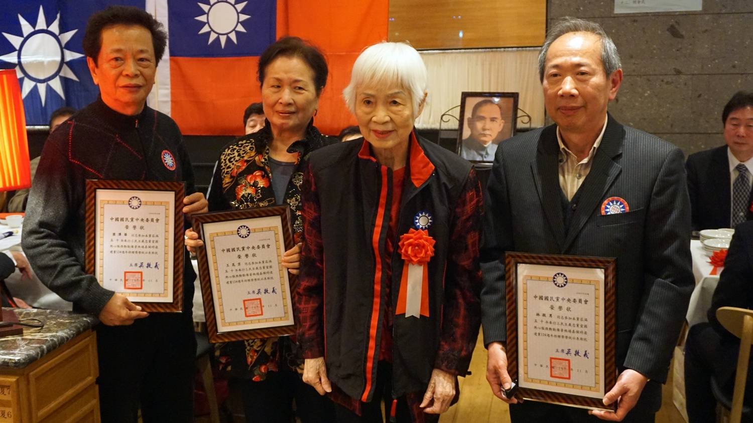 會中也特別請中央評議委員林雪美、莊海樹、馮汝誠分別頒發入黨五十年的黨員榮譽狀、徽章,以及九合一地方大選有功人員感謝函、助選感謝狀,而在猜燈謎時,李懋鑌主席還特別裝扮成財神爺,頒獎給猜對的來賓,最後眾人也一同合唱《中華民國頌》,將氣氛帶到最高潮,為這次的新年會畫下圓滿的句點。