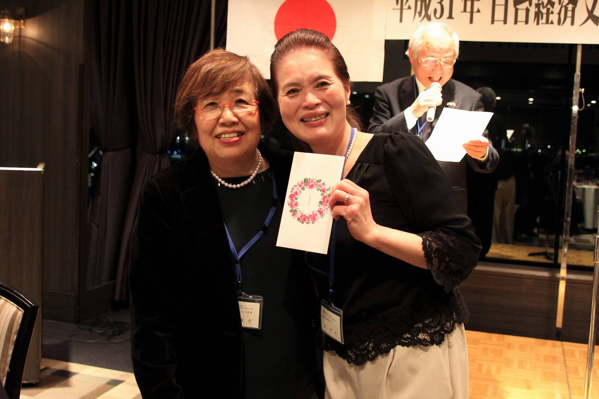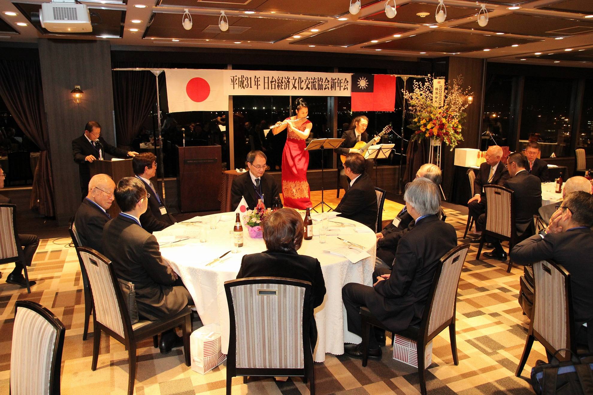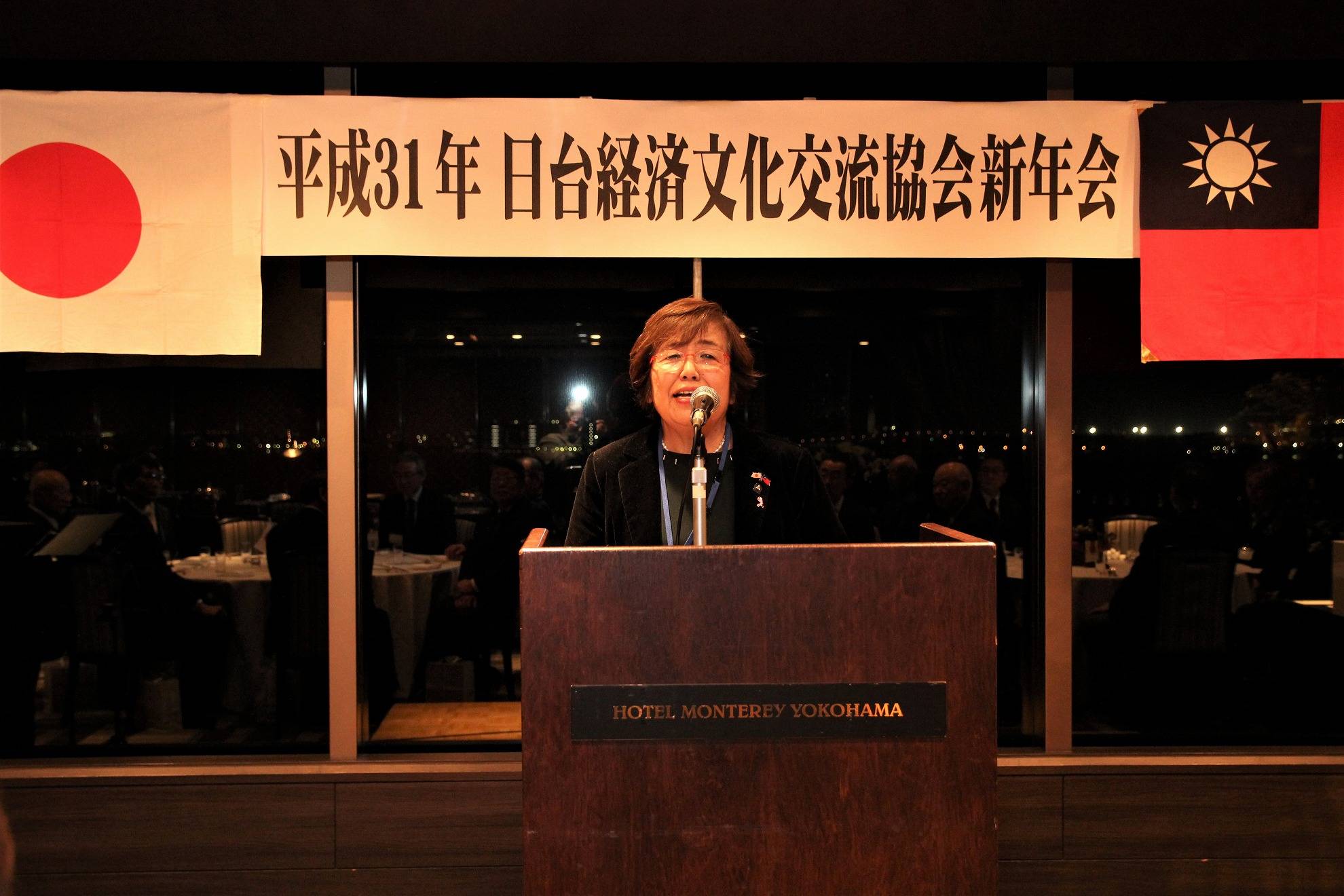 日台經濟文化交流協會會長上村直子對於能在一年之初舉辦這樣非常有意義的交流會,感到相當開心,並感謝大家的出席。而新年會的氣氛相當和諧,因為日台經濟文化交流協會同時也請到著名的演奏家吉川久子帶來長笛的演出,優雅的音樂再配上從十三樓眺望下去的橫濱港絕美夜景,讓眾人都覺得相當放鬆、平靜。