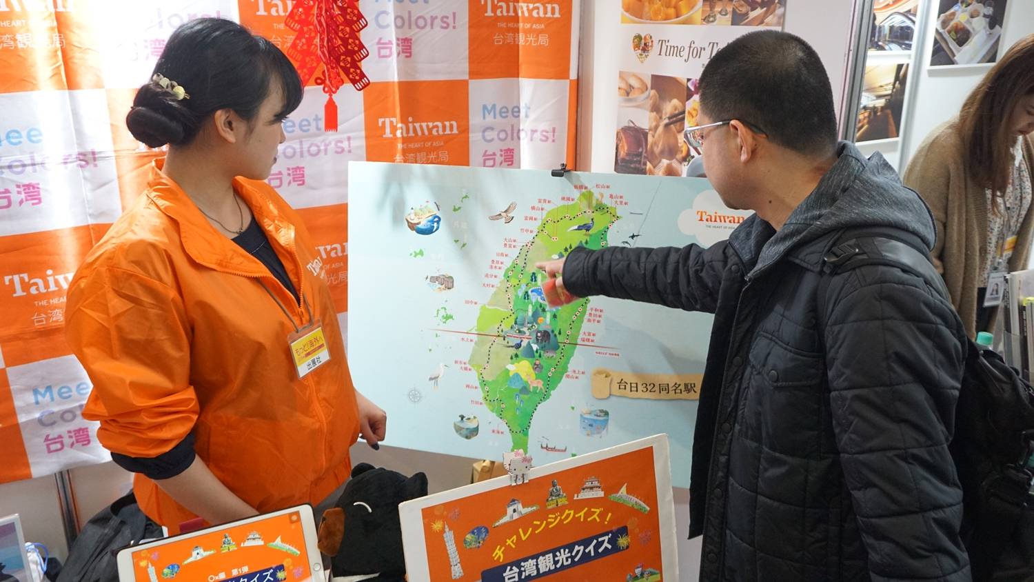 這次觀光局東京事務所與華航一同展出,準備各式各樣的觀光文宣供民眾帶回,以及設計三道與台灣相關的觀光問題,只要有答對的民眾都能拿到印有台灣特色的實用小物,另外也特別安排製作提燈活動,特別迎合今年的豬年,提供可愛的豬造型燈。