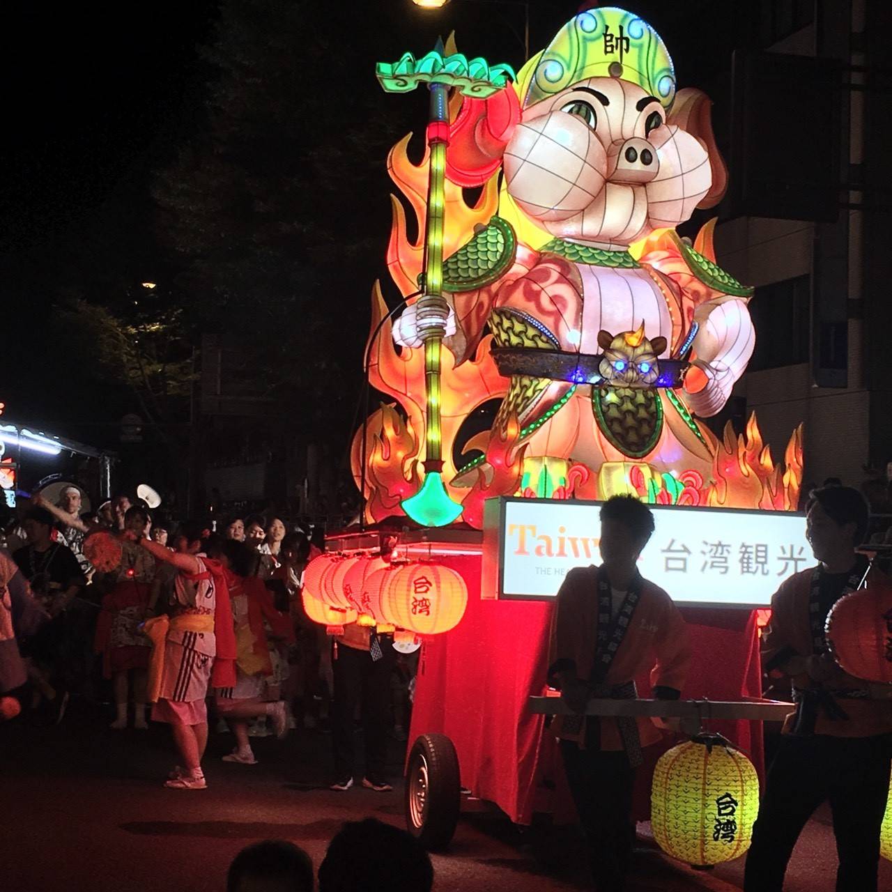 【青森/綜合報導】青森睡魔祭(ねぶた祭)從八月二日至七日登場,交通部觀光局今年特別借到屏東監獄製作之大型花燈作品火焰戰豬-天蓬元帥「初陣」,參與這次的遊行隊伍,展現台灣繽紛的花燈外,也藉此宣傳台灣,成功吸引沿路民眾的目光,紛紛發出「啊!是台灣ㄟ」驚呼聲,並表示喜歡台灣,想去台灣。