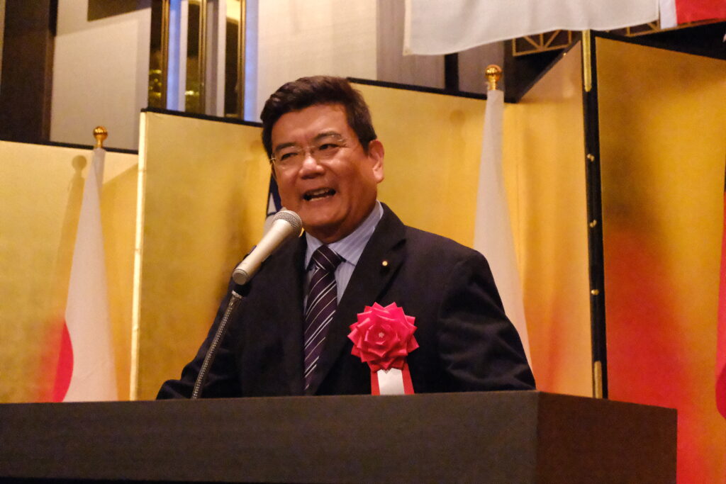 眾議院議員美延映夫則首先提到,對於日本和中華民國沒有邦交,令他在心情上感到相當寂寞,他接著表示自己在過去五六年間,跟郭重信會長一起在許多臺日事務上通力合作,而自己也聽說了民主的臺灣社會,將在明年迎來總統選舉,他誠心祝福臺灣在未來的發展,以及與日本間的交流都能順利進行。