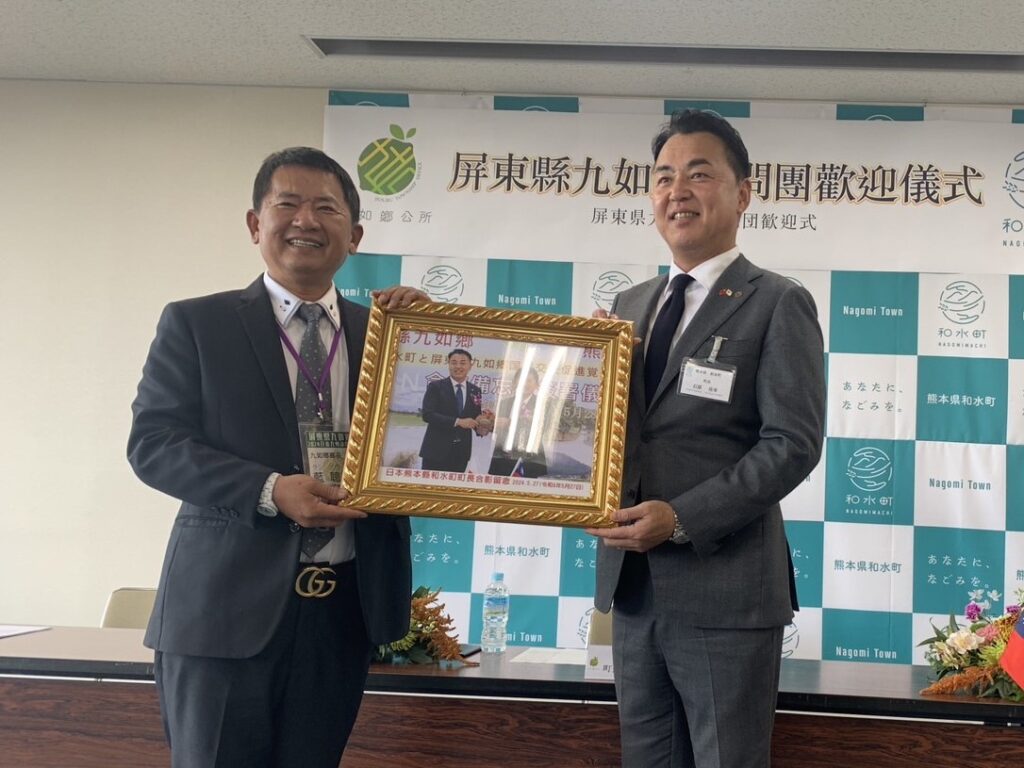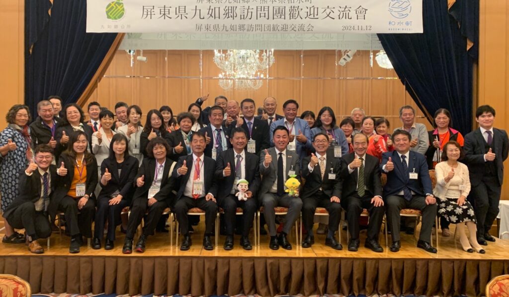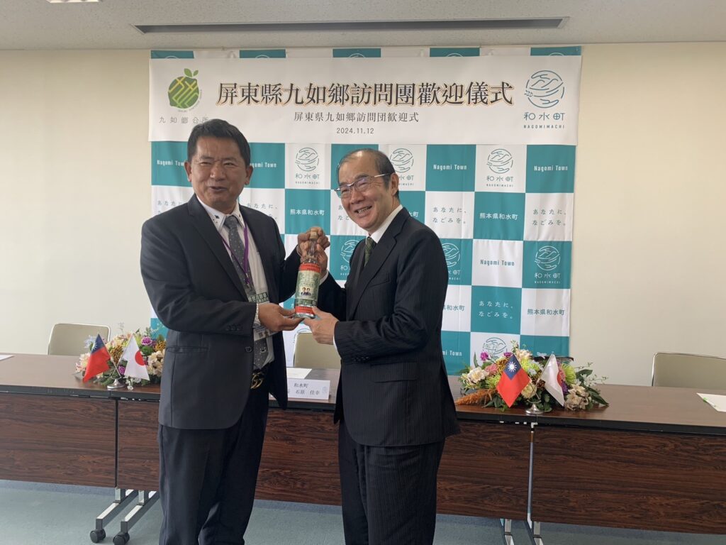 【熊本/綜合報導】經福岡辦事處積極牽線之屏東縣九如鄉與熊本縣和水町於今年2月第一次進行線上首長會議後,5月份和水町石原佳幸町長親自率團訪問九如鄉,雙方簽訂合作備忘錄,展現致力推展合作與交流之決心。為感謝石原町長訪問,11月12日九如鄉藍聰信鄉長大規模組團回訪,充分展現兩鄉鎮友好情誼。