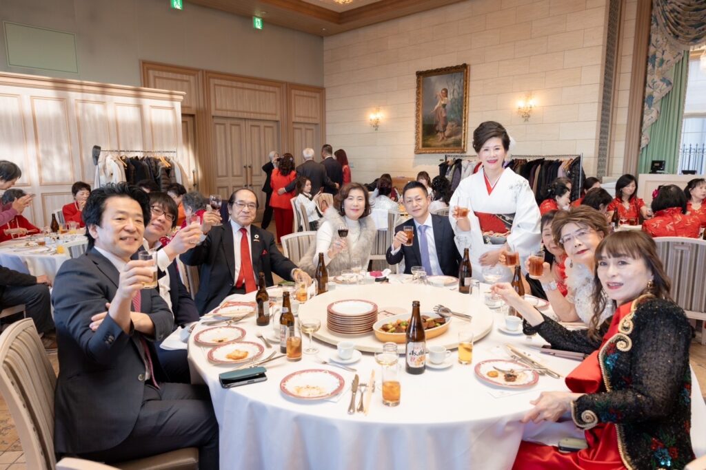 接著由國策顧問謝美香名譽會長主持開幕的乾杯音頭儀式。本次新年會將會員分為紅白兩組,進行紅白歌唱對抗賽,世華會員以紅色和白色為主題,盛裝打扮出席,會場繽紛美麗。每當紅、白歌手上台表演時,其他會員都會自動上台伴舞,展現團隊精神。二隊實力相當,最後以些許差距由紅組獲勝,獲得獎金和獎品。另外也舉辦豪華抽獎,有大阪、台北來回機票和大紅包,獎品眾多,幾乎通通有獎,還有創會長俞秀霞為大家準備紅豆年糕,作為伴手禮,賓主盡歡。最後則由第一副會長中西美姬致閉幕詞。