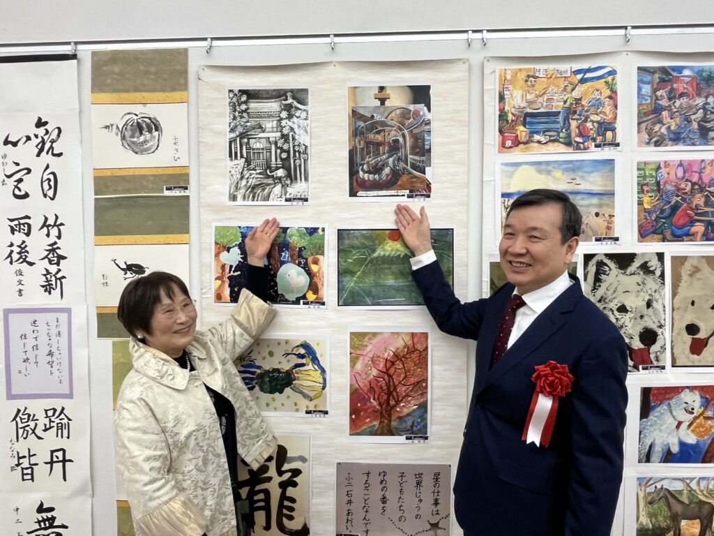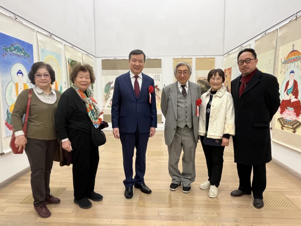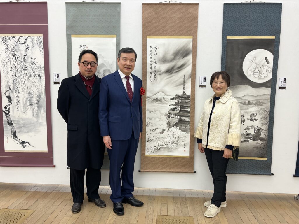 李逸洋大使特別感謝僑胞的大力促成及台灣文化中心的協助,在台灣展區前與中山玉惠醫師及台灣文化中心曾鈐龍主任合影留念。李大使在開幕致詞時也表示,藝術是超越國家與地域界限的語言,台灣一直致力於文化藝術的國際交流,誠摯地希望透過這樣的展覽,持續跟各國交流,讓世界更深入地認識台灣的藝術發展與創新精神。