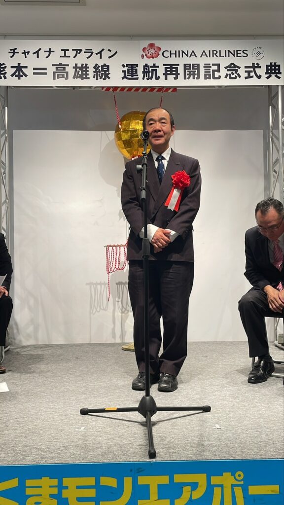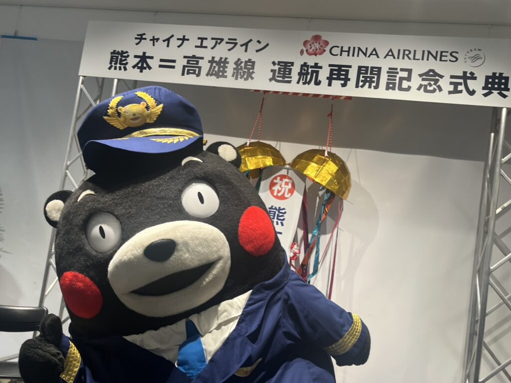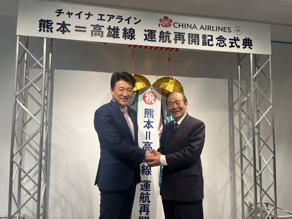 【熊本/綜合報導】中華航空於2月3日起恢復因疫情停航的「高雄ー熊本」航線,為台日兩地民眾提供更便利的交通選擇。中華航空於當日舉辦復航儀式,出席者包含熊本国際空港株式會社山川秀明代表取締役社長、亀崎直隆熊本縣副知事、李宜洲華航日本支社長、前防衛大臣木原稔衆議員、福岡辦事處陳銘俊處長等人,此外,熊本幾乎所有國會議員也都指派辦公室主任出席祝賀,熊本熊也到場熱舞,場面喜氣熱鬧。