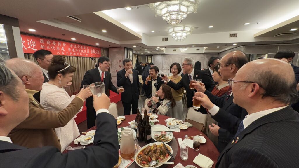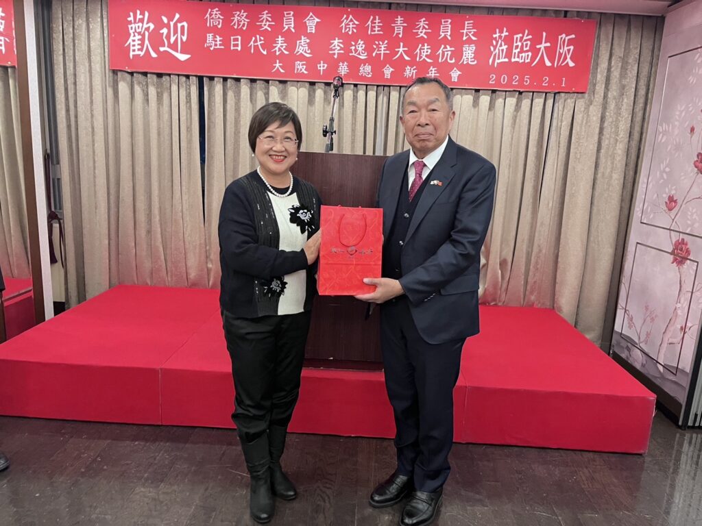 後續大阪府議會中谷恭典議長、大阪市會竹下議長、大阪府議會日華親善議員連盟杉江友介會長等人也上台致意,徐委員長與李大使也贈送致贈紀念品給郭會長及洪里勝信名譽會長。會中僑胞們也利用難得機會與委員長和大使交流和合影,最後則由日本中華聯合總會羅鴻健會長致閉幕詞,為餐會畫下圓滿句點。