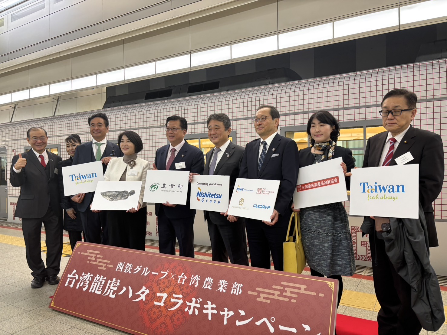 【福岡/綜合報導】台灣著名龍虎斑在農業部、屏東縣及西日本鐵道株式會社集團等各界力促下終於成功銷日,未來西日本鐵道株式會社集團將以龍虎斑製成之魚排等各式料理與產品,在該公司旗下福岡地區的午餐列車(THE RAIL KITCHEN CHIKUGO)、飯店及超市等通路販售,預期日本福岡、九州、京都、北海道札幌等地區民眾皆有機會品嚐到美味的台灣龍虎斑。3月8日「西鐵觀光列車-台灣石斑料理記者會」在福岡天神西鐵Grand Hotel盛大舉行,由農業部黃昭欽次長、屏東縣周春米縣長、西鐵集團社長林田浩一共同主持,駐福岡辦事處陳銘俊處長及屏東縣議員、鄉長、日本各大媒體代表出席。