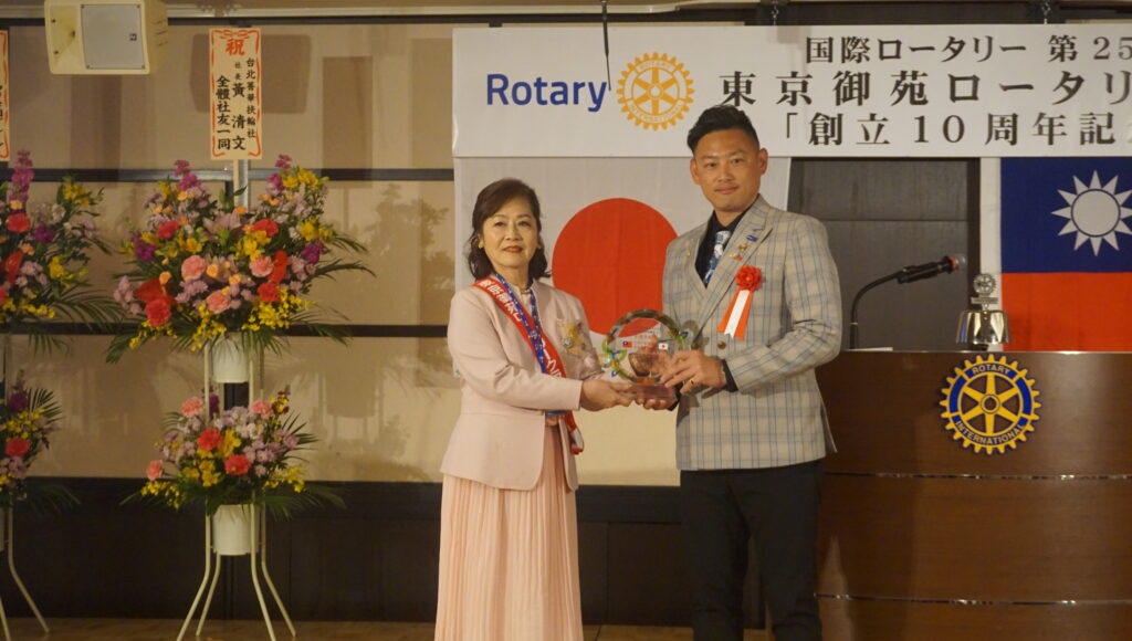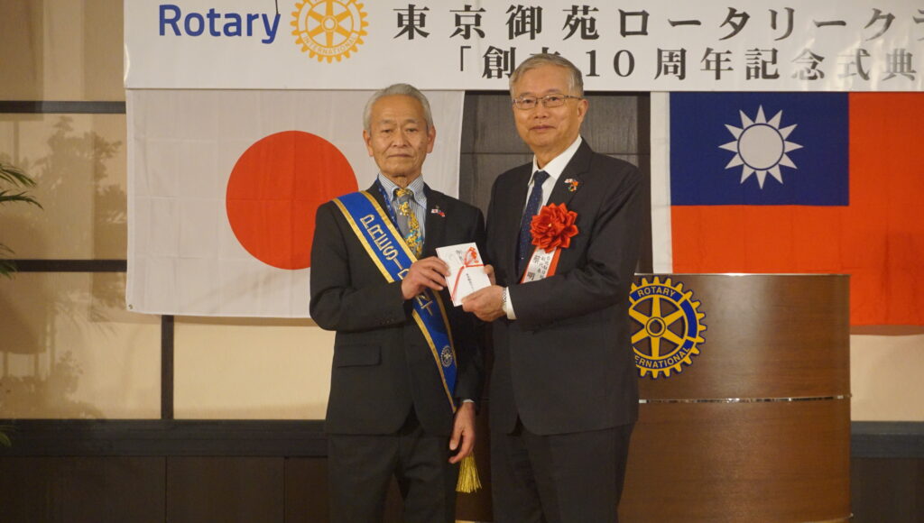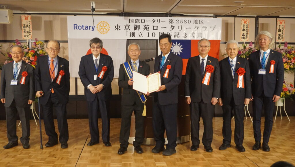 東京御苑扶輪社十周年慶中,除了透過直前會長劉靜慧的協助,安排蔡明耀副代表的演講外,還邀請來自台灣的台北菁華扶輪社及三峽北大菁英扶輪社的成員參加,同時兩社也與東京御苑扶輪社締結國際友好盟約,並由蔡明耀副代表與前國策顧問秦嘉鴻一同見證,希望透過扶輪社的友好牽起台日之間的友好,一同為造福社會努力。
