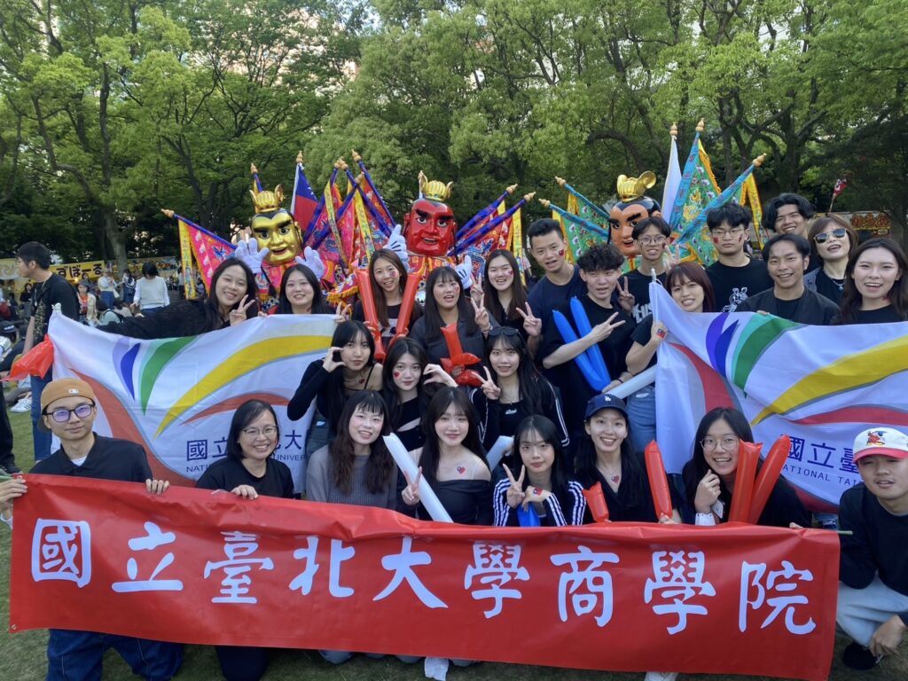 這支生氣勃勃的隊伍由駐福岡辦事處洪育欽副領事、九州台灣同鄉會賴家慧會長(僑務顧問)、僑務諮詢委員海澤洲,以及人氣十足的台灣電音三太子領軍,展現台灣民間力量的凝聚與創意。參與者陣容多元,包括穿著原住民傳統服飾、典雅旗袍、以及融合台灣特色的T恤的會員們,展現豐富的文化層次。特別的是,14位在福岡求學的台灣留學生、5位當地學習台灣華語的師生、以及即將赴台交流的九州共立大學5位師生也熱情加入,更有來自東京、大阪的僑胞跨區共襄盛舉,展現旅日台灣社群的凝聚力。值得一提的是,國立臺北大學由丁姵如老師與黃文曄老師帶領的24位師生,更特地從台北飛來參與,為活動增添國際交流的深度。