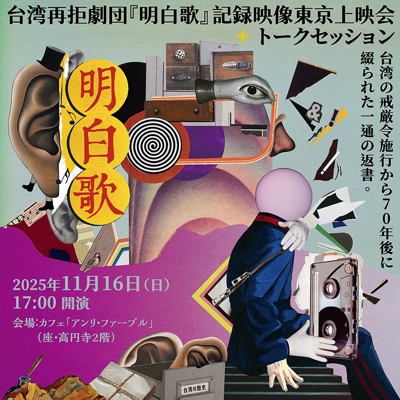 【東京訊】由臺灣再拒劇團製作的音樂說書劇場《明白歌——走唱白色記憶:未竟的故人事與未來歌》演出紀錄放映暨座談會,將於2025年11月16日(星期日)17時至20時在カフェ「アンリ・ファーブル」(座・高円寺2階)舉行。活動免費入場,可事先填寫報名表,亦歡迎民眾當日直接前往參加。