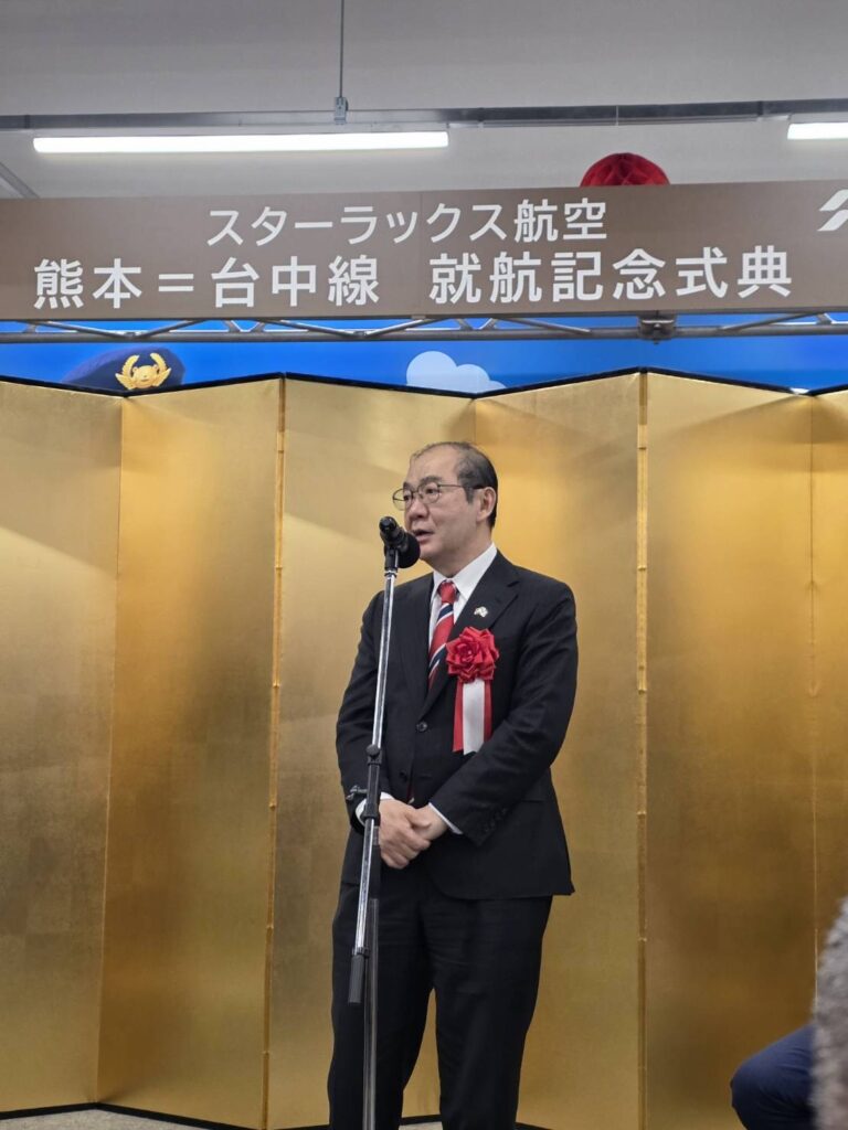 熊本機場山川秀明社長致詞時表示,台灣熊本每週23航班,而台中航班更為九州地區首航,感受到熊本跟台灣的緊密連結。熊本縣木村敬知事亦指出此航線為連結台灣跟熊本的第四條航線,並感謝台灣人於10年前熊本地震時給予的援助,回顧這十年災後重建及台熊關係,由震後的熊本高雄航班擴增至四條航線,深感榮幸。