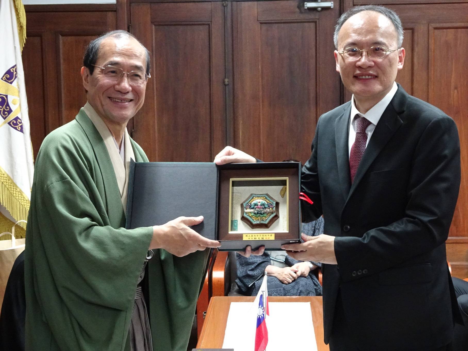 訪問團一行贈芒果干、劍獅等象徵台南的紀念品,京都市長也回贈京都舞妓圖樣的可愛別針及「DO YOU KYOTO」環保推廣活動用品。隨行前來的台南市議員李退之轉交台南市長賴清德的書信,信中提到過去幾年與京都的交流,感謝京都市在台南城市發展上給予協助,下個月(8月)預定再次造訪,敘舊之餘,期盼針對兩個城市未來的發展交換意見。李退之認為,「台南跟京都是台日兩國非常重要的古都,城市發展的軌跡亦有很多相似的地方 ,過去在兩邊的市議會已經推動了相當多的交流,京都市議會也會在近期內來訪,希望兩邊正式的市政交流能夠在近期內有所開展」。京都市議長寺田一博感謝列席的京都華僑總會會長魏禧之在京都與台南的交流中給予協助,希望台南女中一行在短暫停留期間能夠感受京都的城市風貌,也期待兩地議會交流能帶動人民的互訪交流。