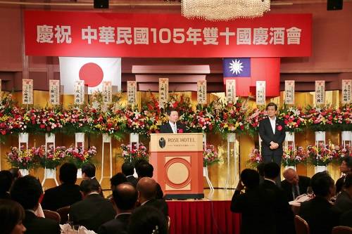 台北駐日經濟文化代表處(簡稱駐日代表處)於10月6日在東京PALACE飯店舉辦中華民國105年國慶酒會,現場包括日本交流協會會長大橋光夫、日華議員懇談會(簡稱日華懇)幹事長古屋圭司、副會長山東昭子、衛藤征士郎、外務副大臣岸信夫和日本前首相福田康夫等日本政界人士出席之外,教廷、巴拿馬和多明尼加等國駐日大使也應邀出席,旅日僑胞以日本中華聯合總會會長毛友次為首,東京地區各僑團領袖亦與會共襄盛舉,約2000人一起慶祝雙十國慶。