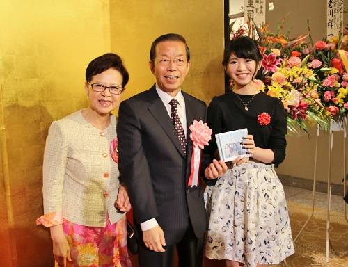 日本偶像團體AKB48台灣團員馬嘉伶(右)出席國慶酒會,和駐日代表謝長廷伉儷合影,成為晚會的亮點